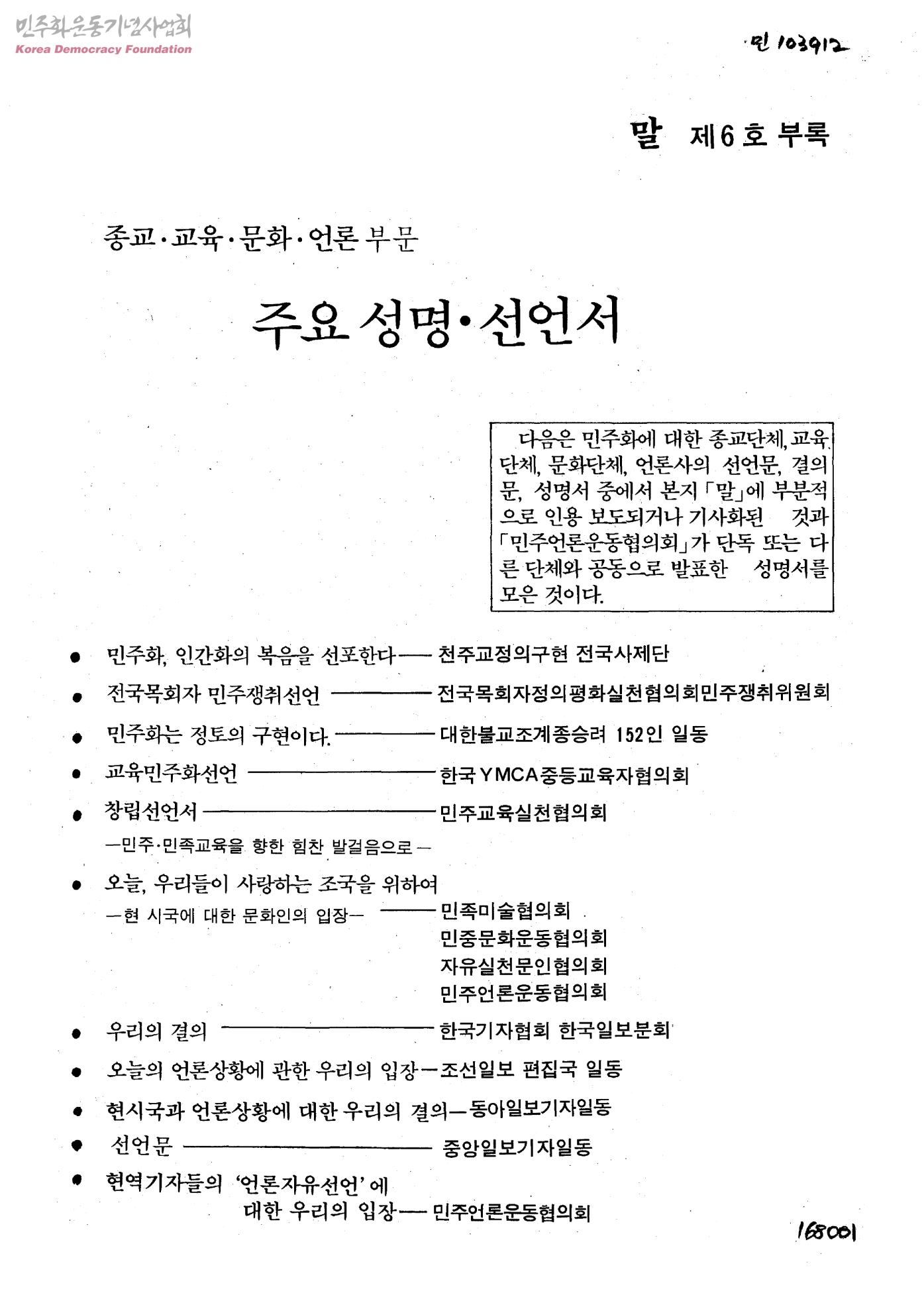 말 제6호 부록-종교.교육.문화.언론 부문 주요 성명, 선언서