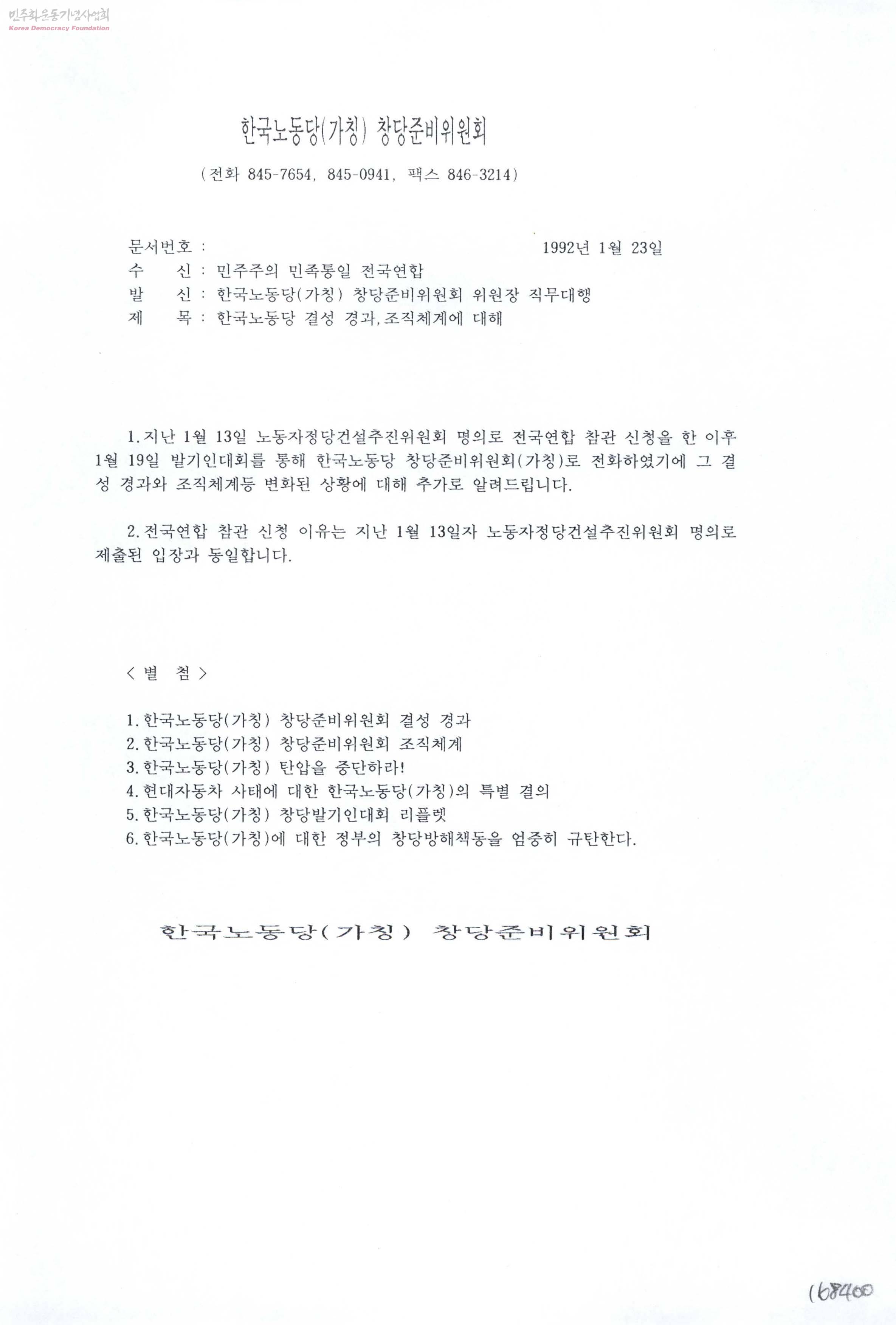 한국노동당 결성 경과, 조직체계에 대해[수신:민주주의민족통일전국연합,발신:한국노동당(가칭)창당준비위원회 위원장 직무대행]