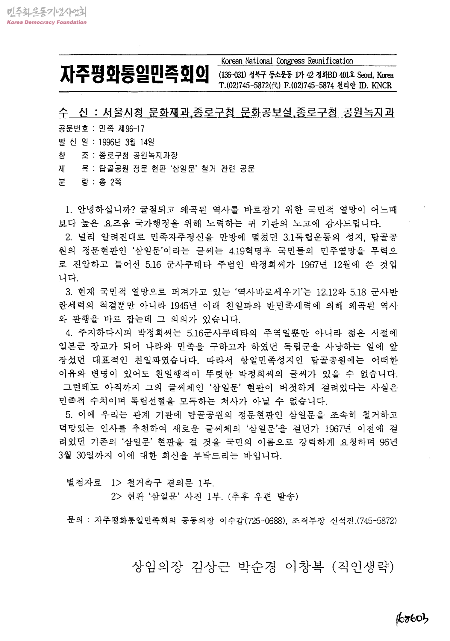 탑골공원 정문 현판 '삼일문' 철거 관련 공문[수신:서울시청 문화재과,종로구청 문화공보실,종로구청 공원녹지과]