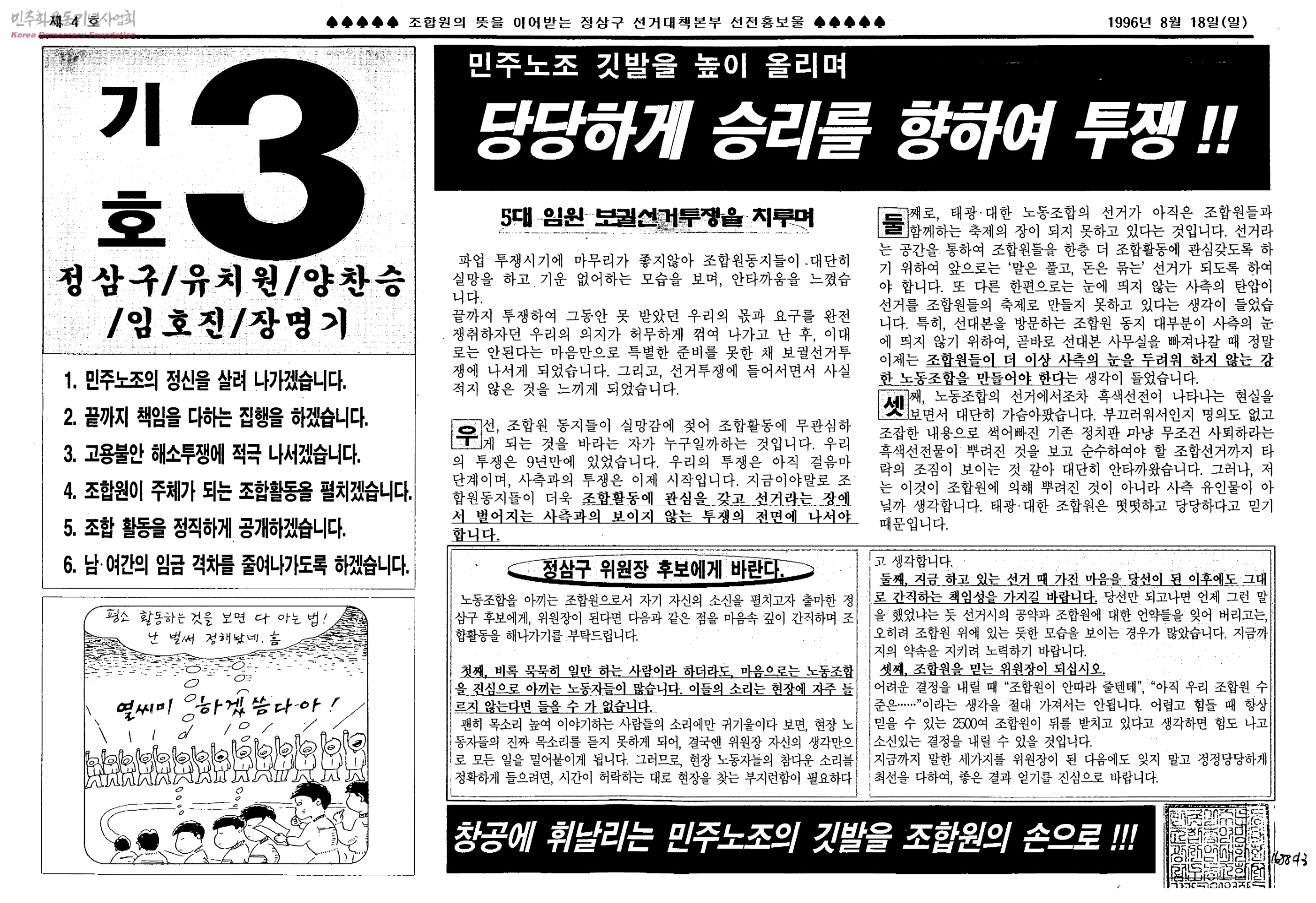 조합원의 뜻을 이어받는 정삼구 선거대책본부 선전홍보물 제4호-기호3 정삼구/유치원/양찬승/임호진/장명기-민주노조 깃발을 높이 올리며 당당하게 승리를 향하여 투쟁