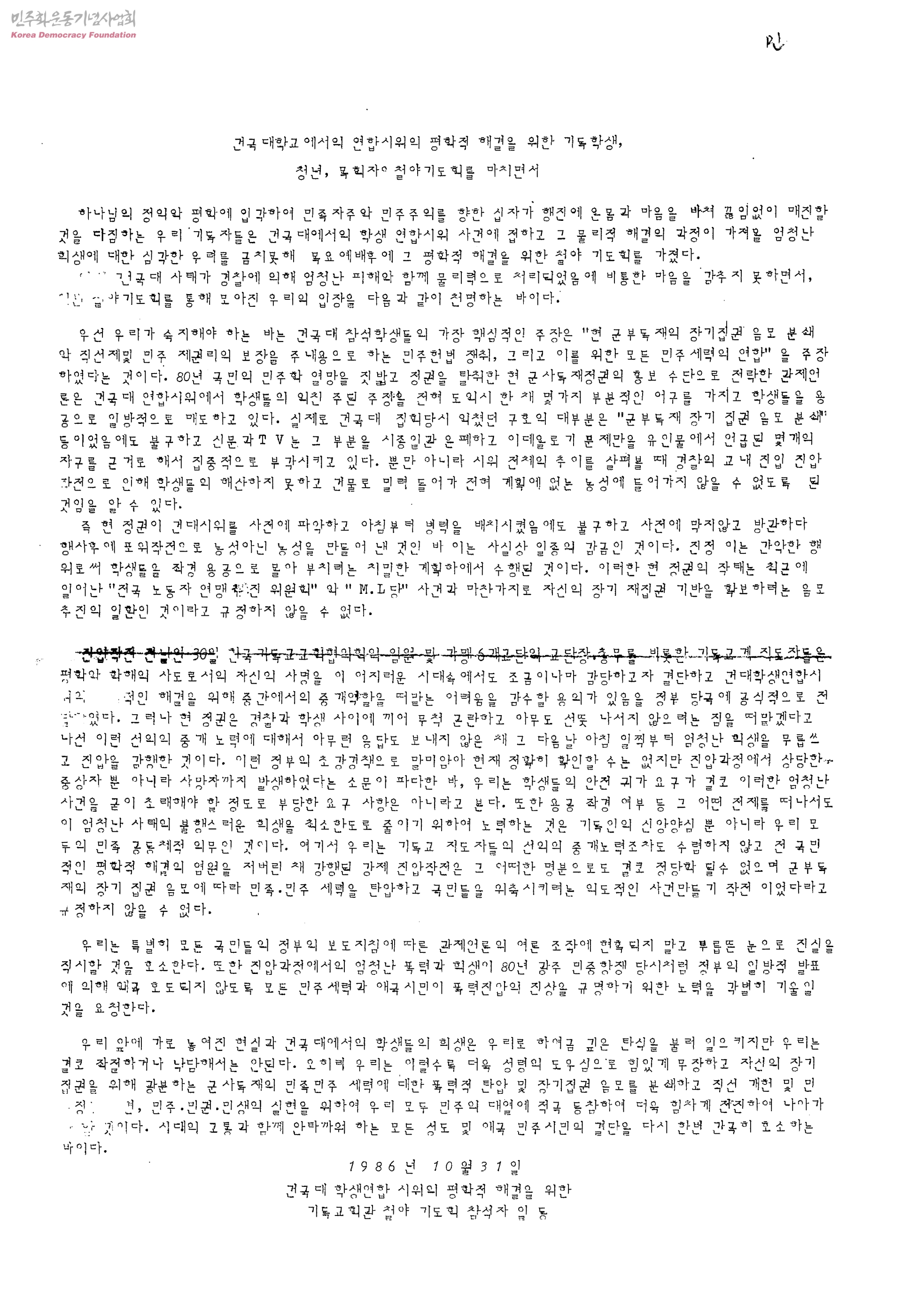 - 건국대학생연합시위의평화적해결을위한기독교회관철야기도회참석자일동