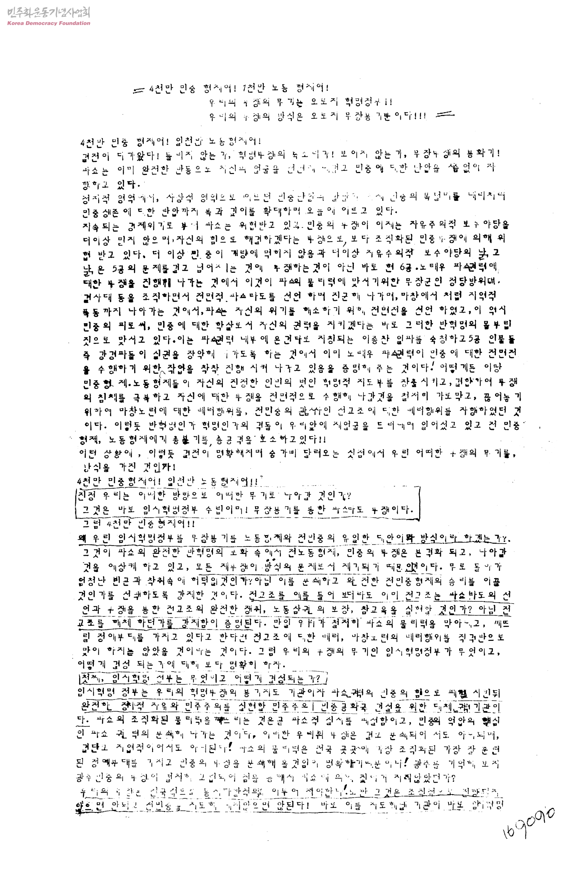 4천만 민중 형제여! 1천만 노동 형제여! 우리의 무장의 무기는 오로지 혁명정부!! 우리의 투쟁의 방식은 오로지 부장봉기 뿐이다