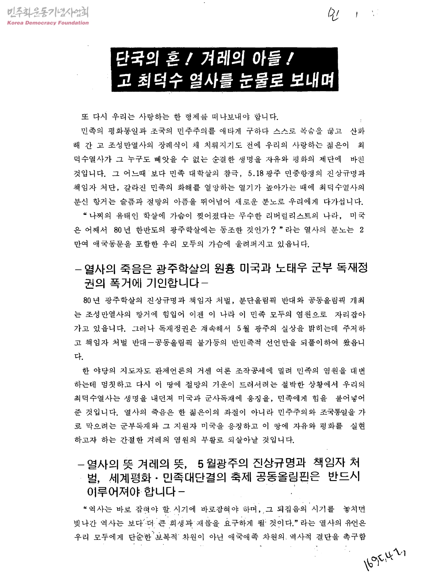 단국의 혼! 겨레의 아들! 고 최덕수 열사를 눈물로 보내며