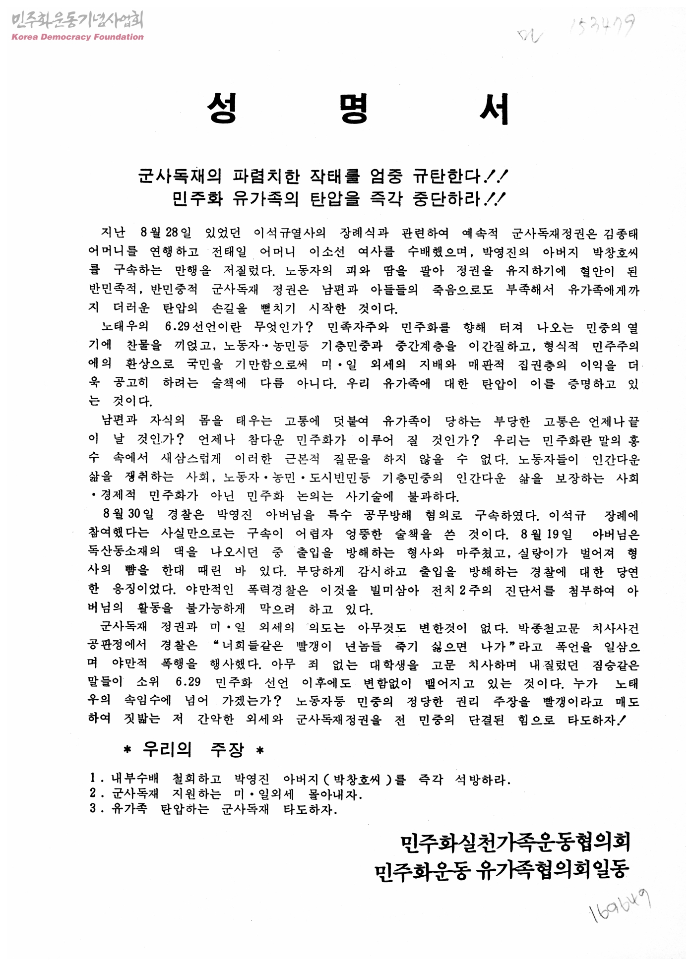 성명서 "군사독재의 파렴치한 작태를 엄중 규탄한다! 민주화 유가족의 탄압을 즉각 중단하라"