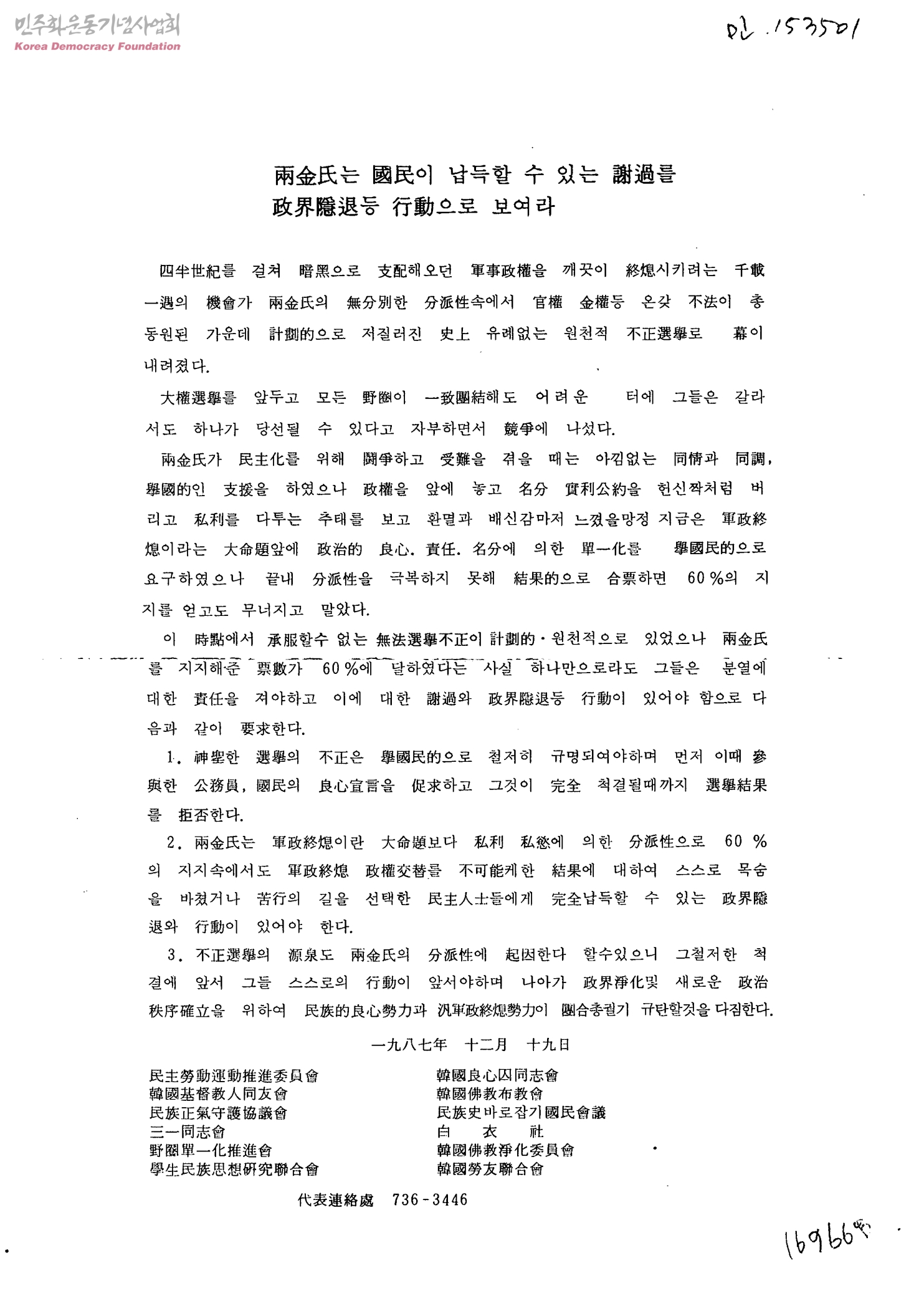 兩 金氏는 國民이 납득할 수 있는 謝過를 政界隱退 등 行動으로 보여라