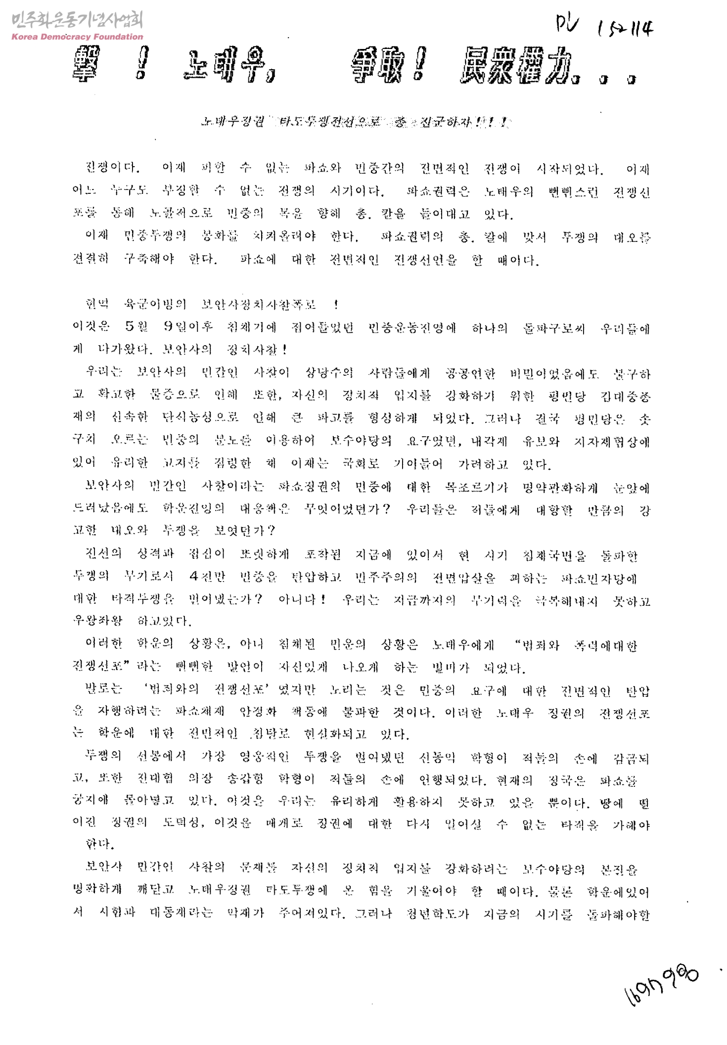 擊! 노태우, 爭取! 民衆權力… 노태우정권 타도투쟁전선으로 총 진군하자