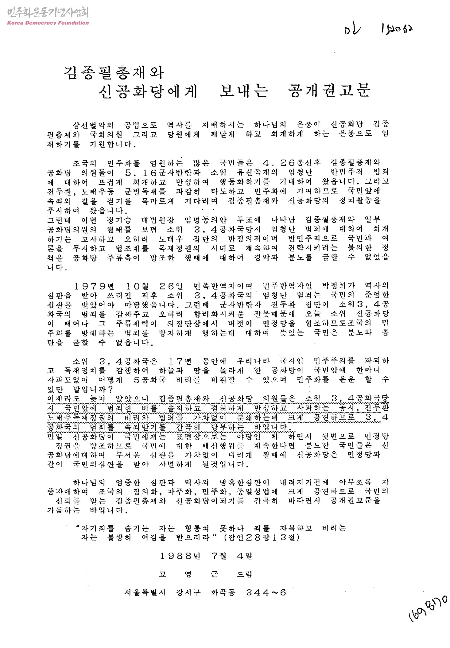 김종필총재와 신공화당에게 보내는 공개권고문