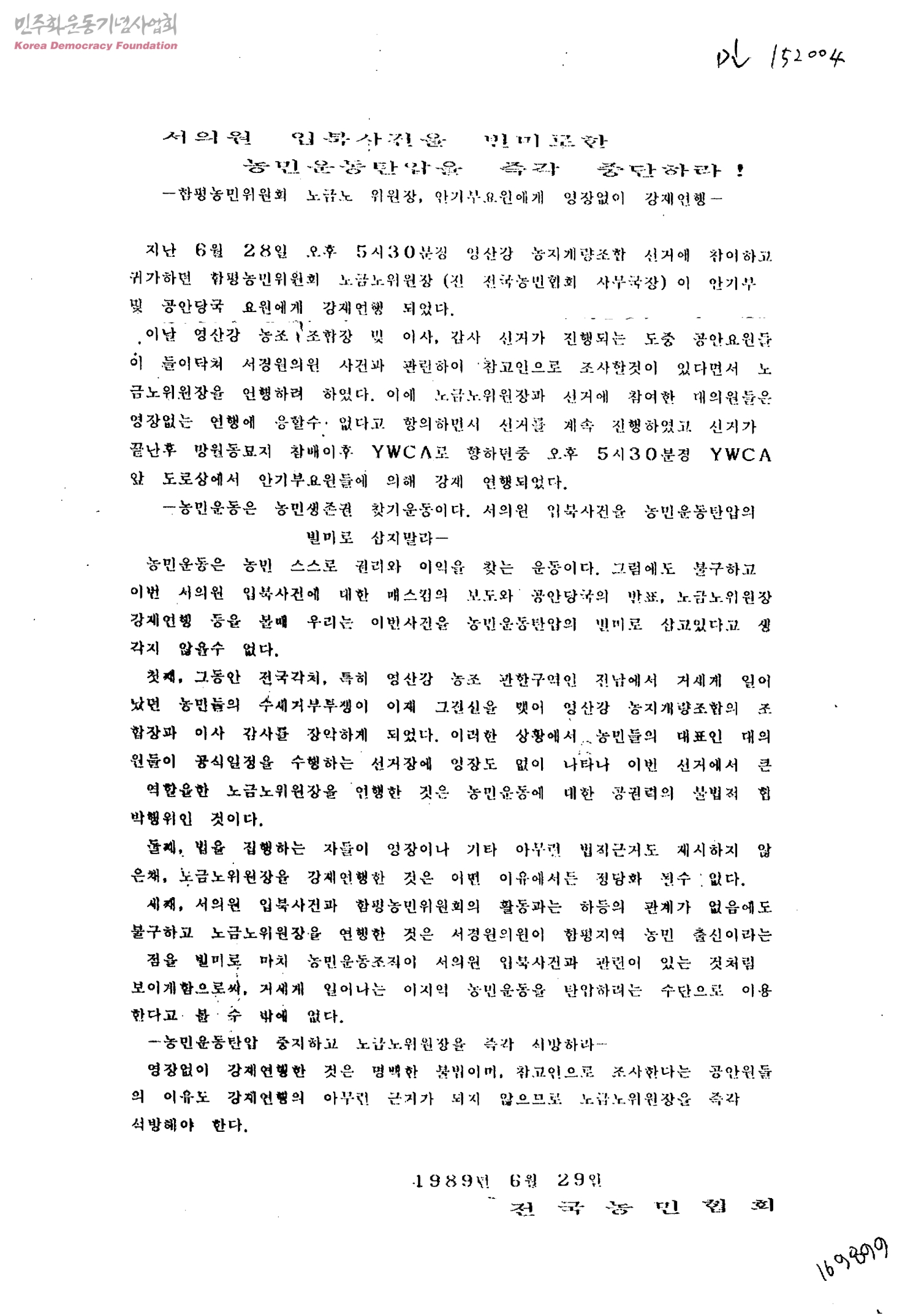 서의원 입북사건을 빌미로 한 농민운동탄압을 즉각 중단하라! -함평농민위원회 노금노 위원장, 안기부요원에게 영장없이 강제연행-