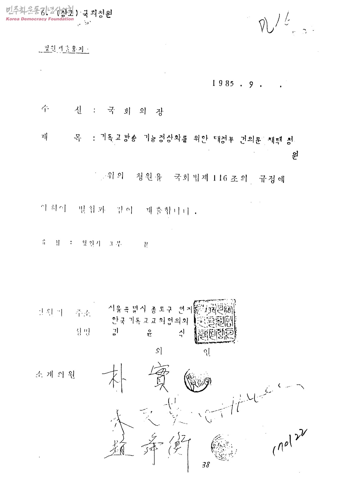 기독교방송 기능정상화를 위한 대정부 건의문 채택청원