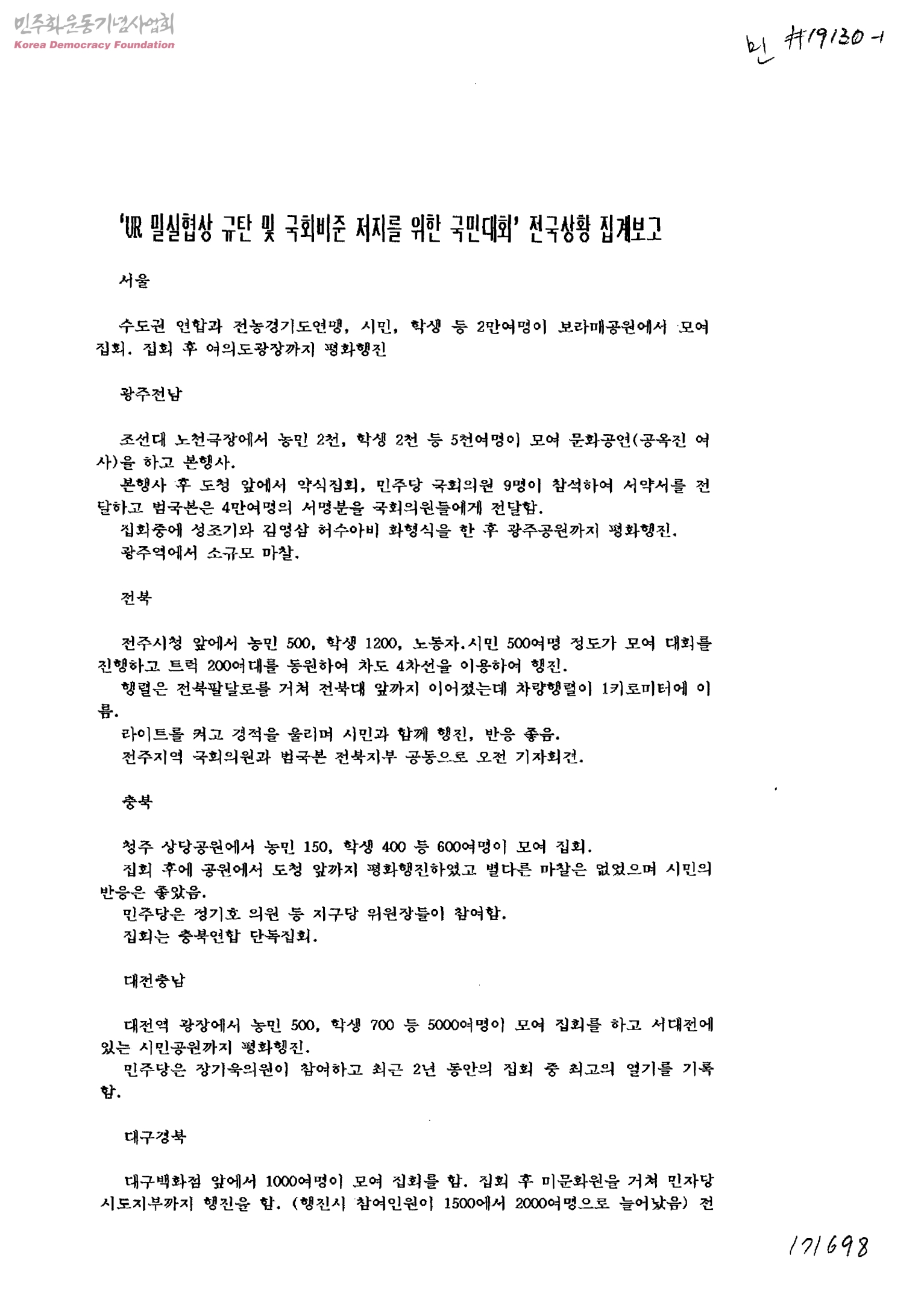 UR 밀실협상 규탄 및 국회비준 저지를 위한 국민대회 전국상황 집계보고