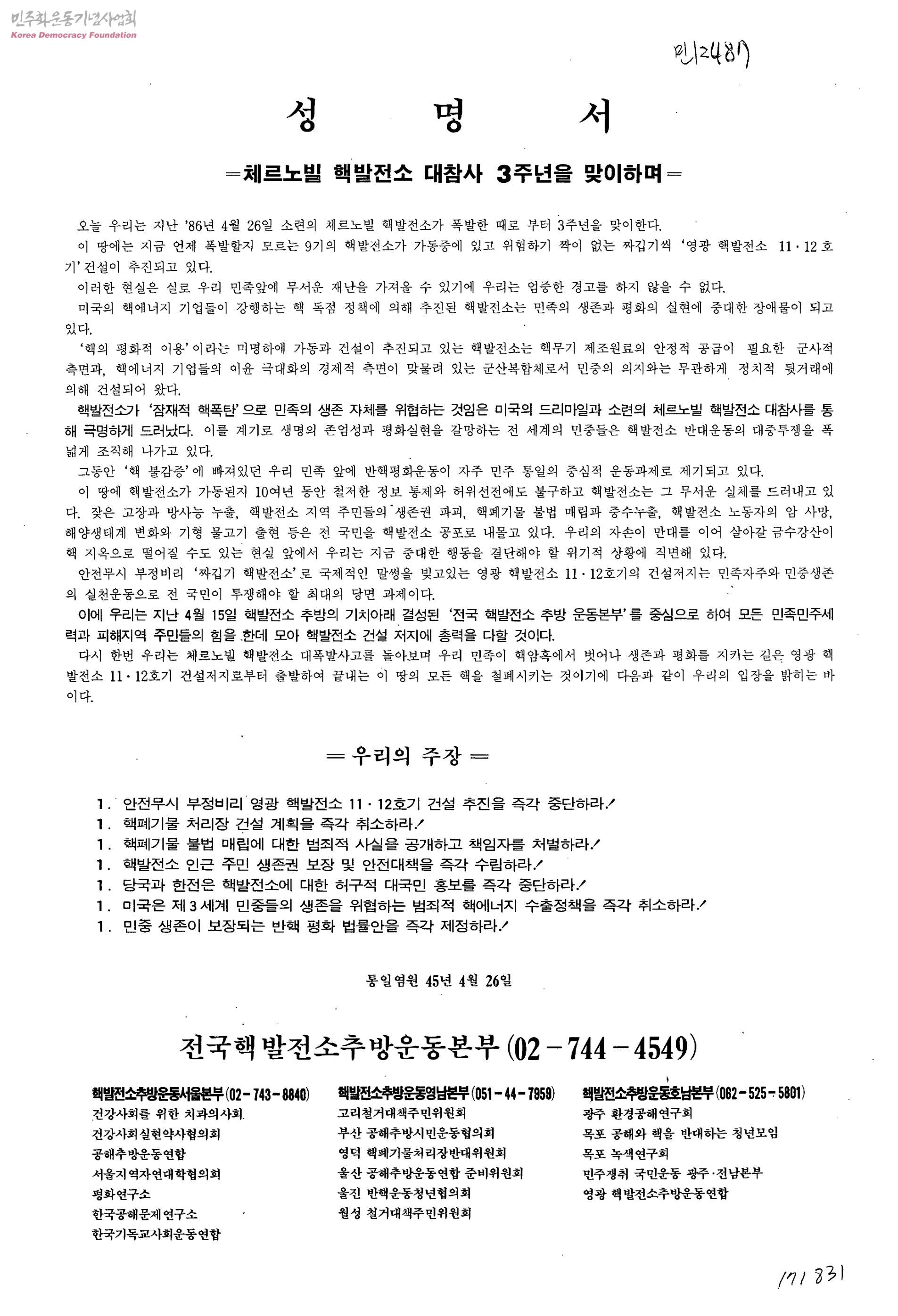 성명서-체르노빌 핵발전소 대참사 3주년을 맞이하여
