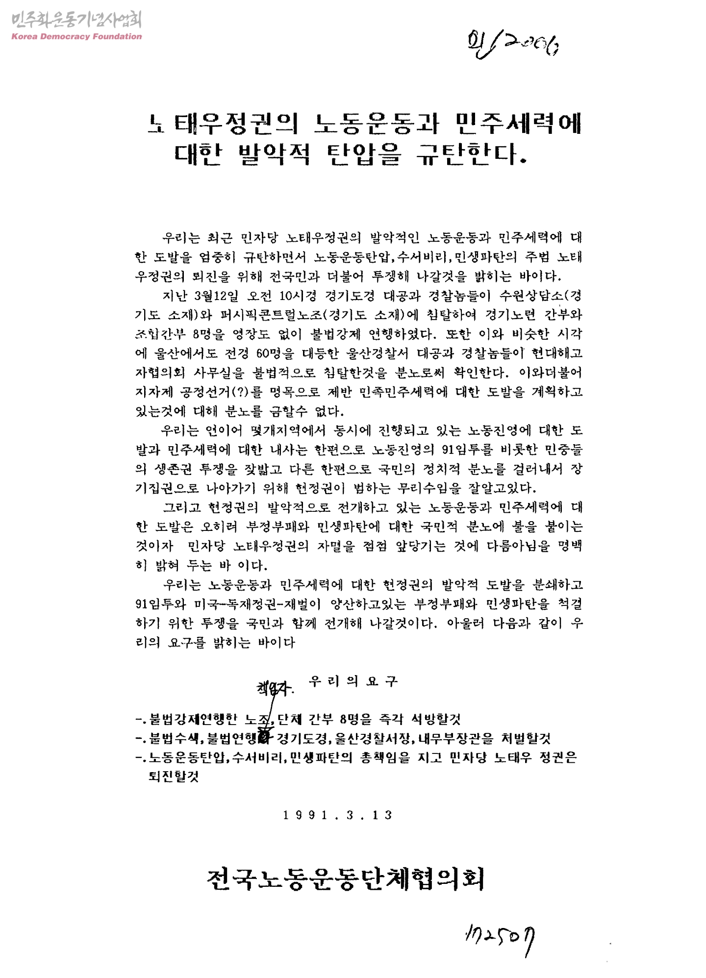 노태우정권의 노동운동과 민주세력에 대한 발악적 탄압을 규탄한다