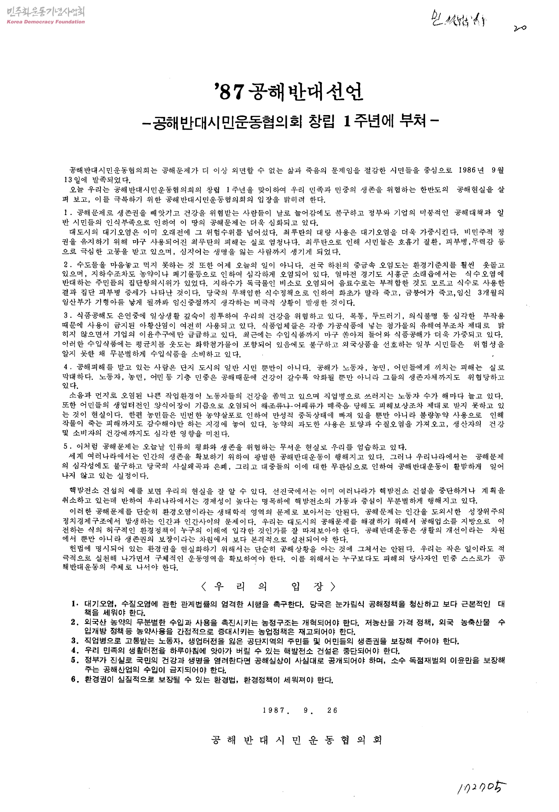 87공해반대선언-공해반대시민운동협의회 창립 1주년에 부쳐