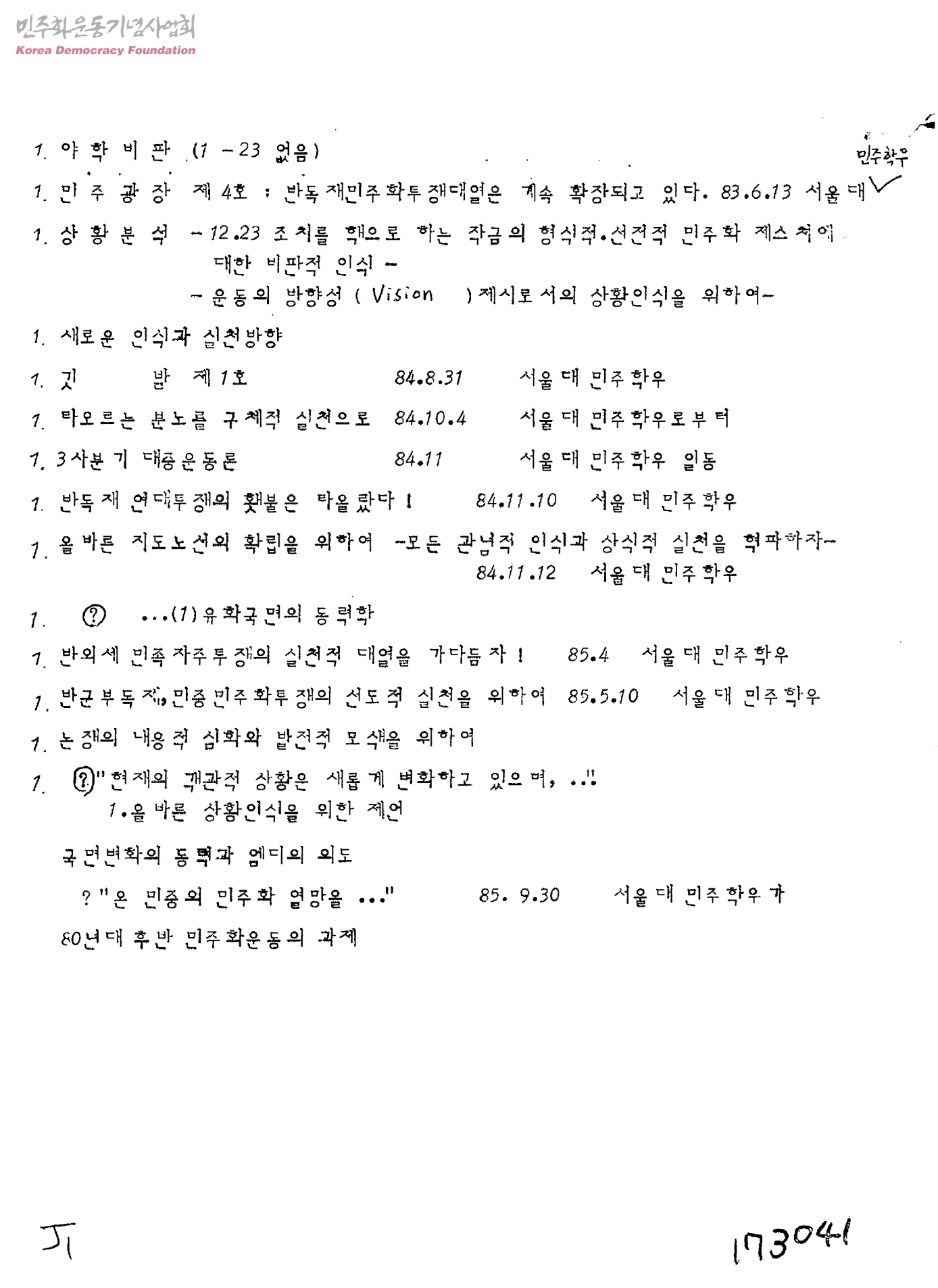 1983~1985년 서울대 민주학우에서 낸 민주화운동관련 서적, 정간물 등의 리스트