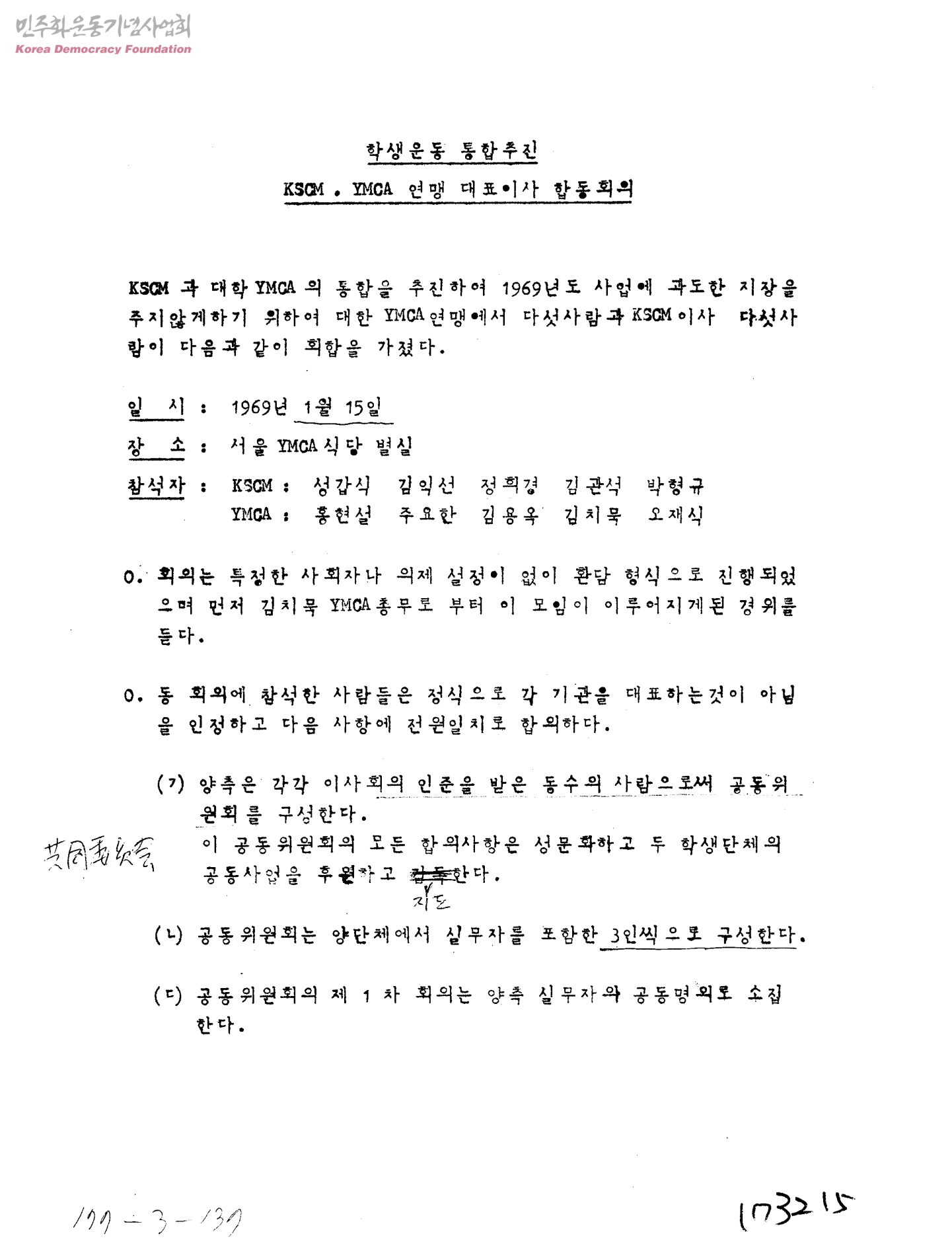 학생운동 통합추진 KSCM YMCA 연맹 대표이사 합동희의