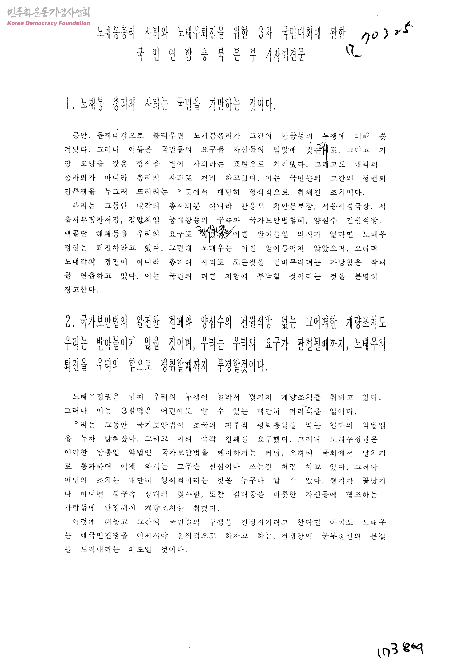 노재봉총리 사퇴와 노태우퇴진을 위한 3차 국민대회에 관한 국민연합충북본부기자회견문