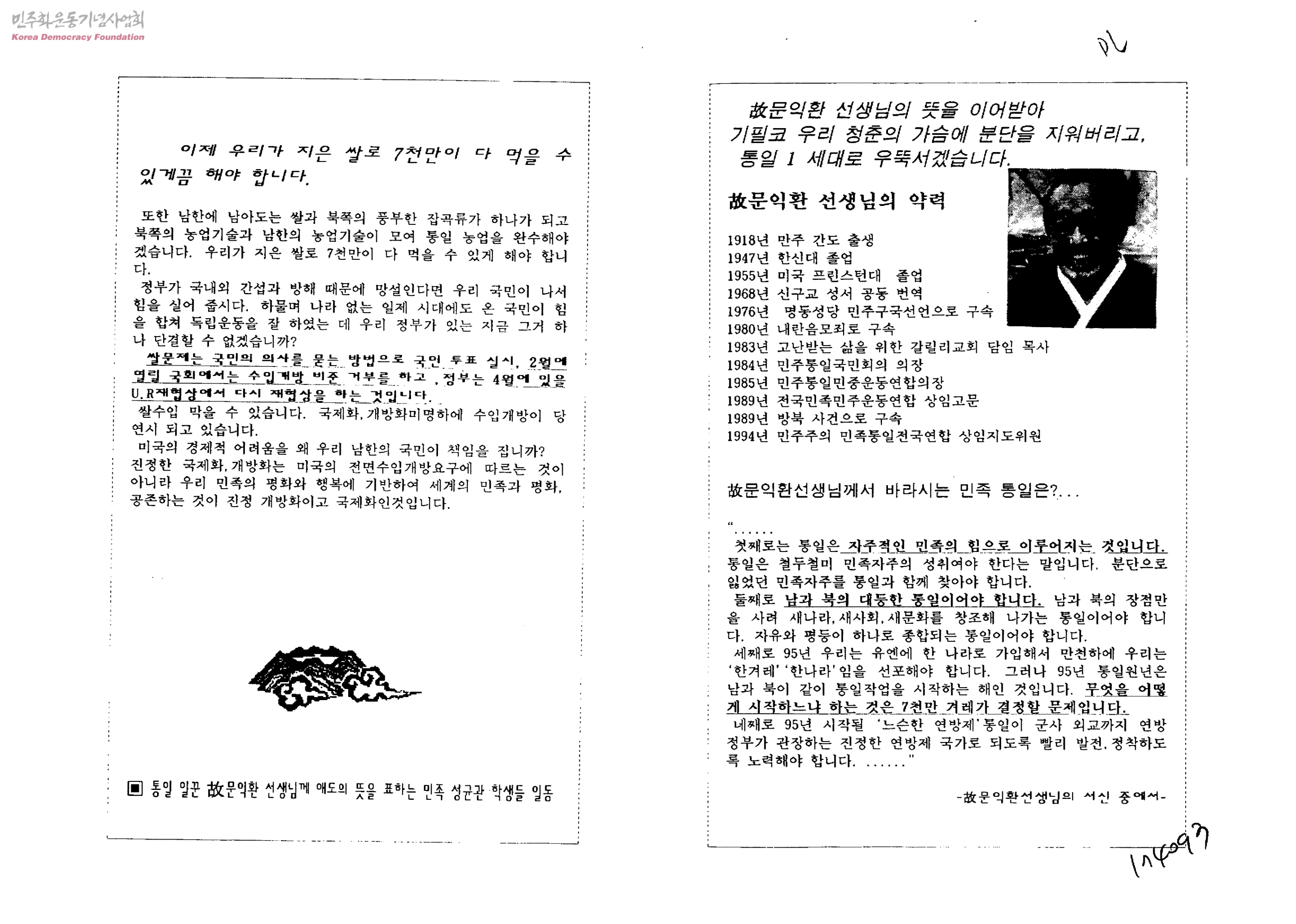 故문익환선생님의 뜻을 이어받아 기필코 우리청춘의 가슴에 분단을 지워버리고, 통일1세대로 우뚝서겠습니다