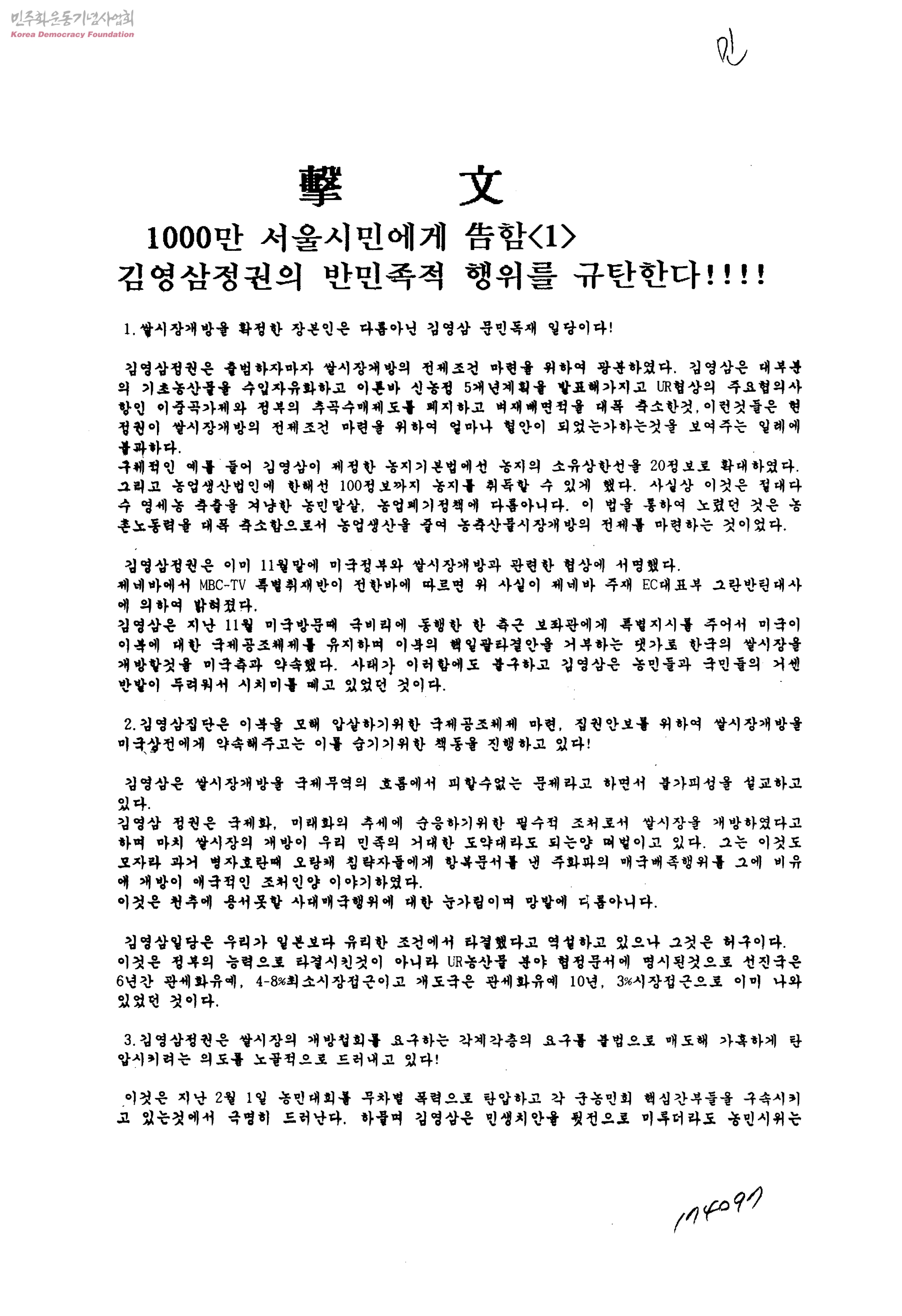 擊文-1000만 서울시민에게 告함<1> 김영삼정권의 반민족적 행위를 규탄한다