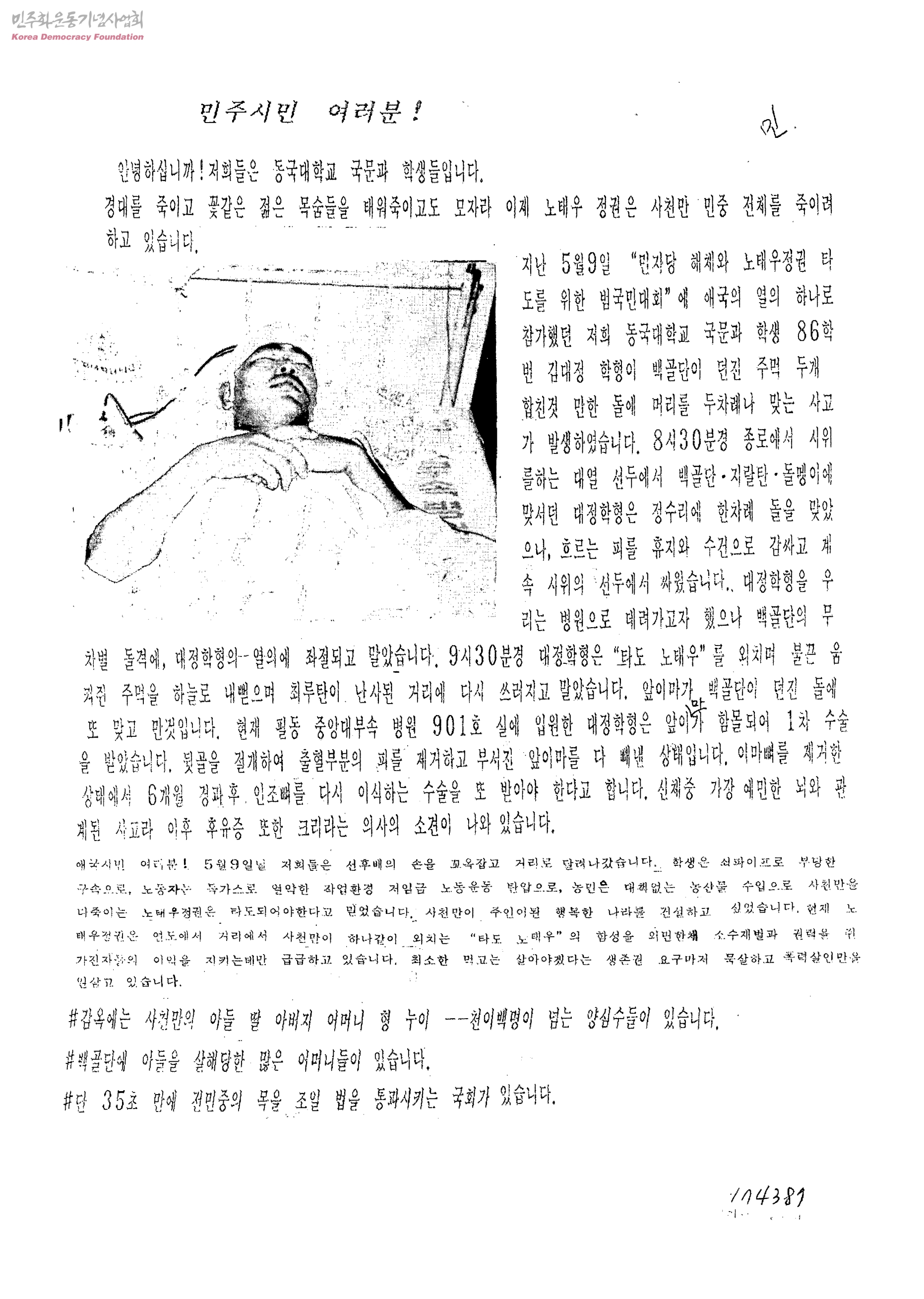 - 김대정학형치료기금모금및노태우정권타도를위한동국대국문과비상대책위원회
