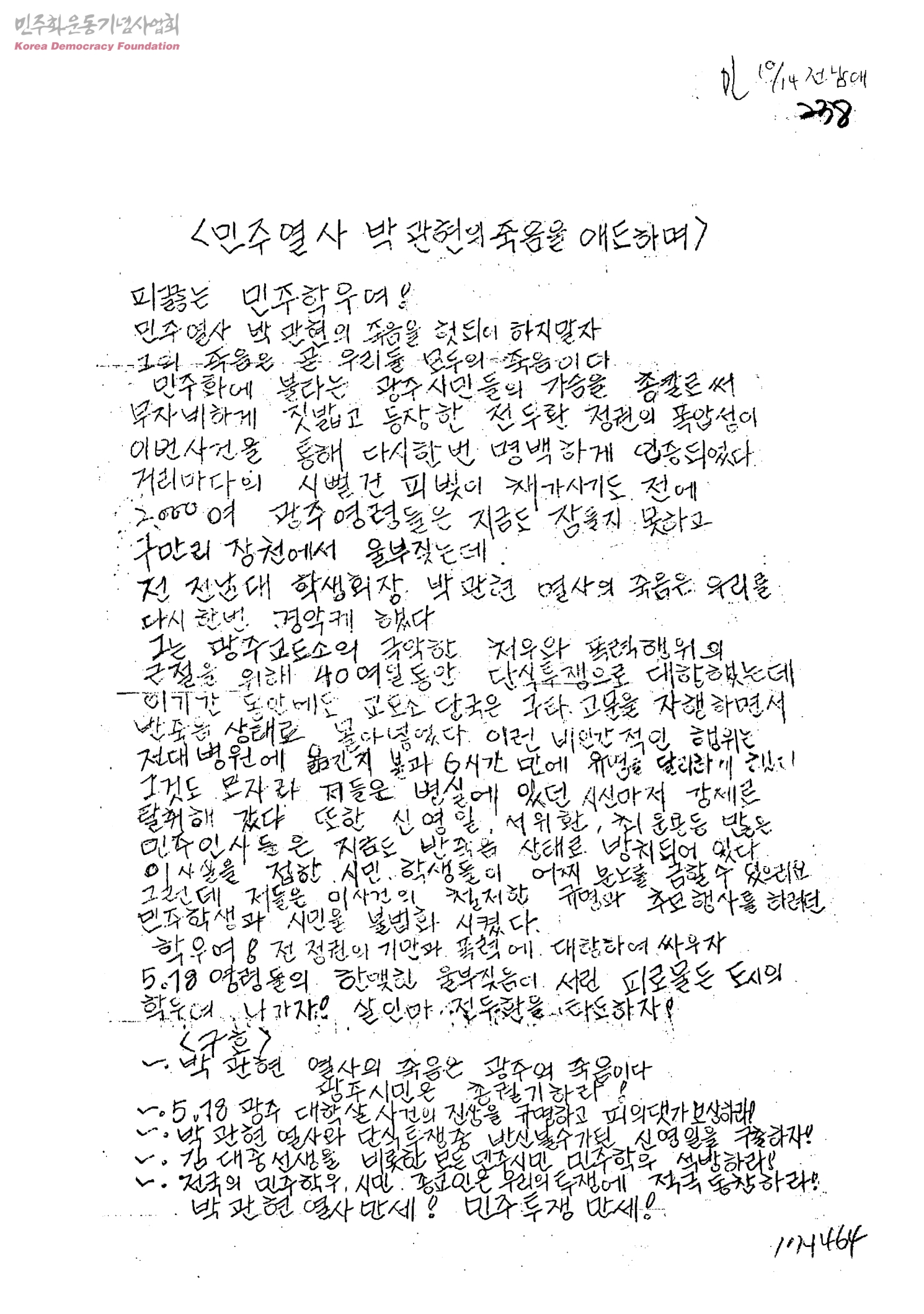 - 생산자 및 기증자가 ‘박용수’인 사진의 사용은 구매신청을 클릭하여 직접 사진 구매 신청을 하실 수 있습니다. 생산자 및 기증자가 ‘경향신문사’인 사진의 사용은 경향신문사 담당자(02-3701-1635)를 통해 구매하실 수 있습니다. 그 외의 생산자 및 기증자는 민주화운동기념사업회 사료관 담당자( hyunchaek@kdemo.or.kr / 02-6440-8961 )에 문의바랍니다.