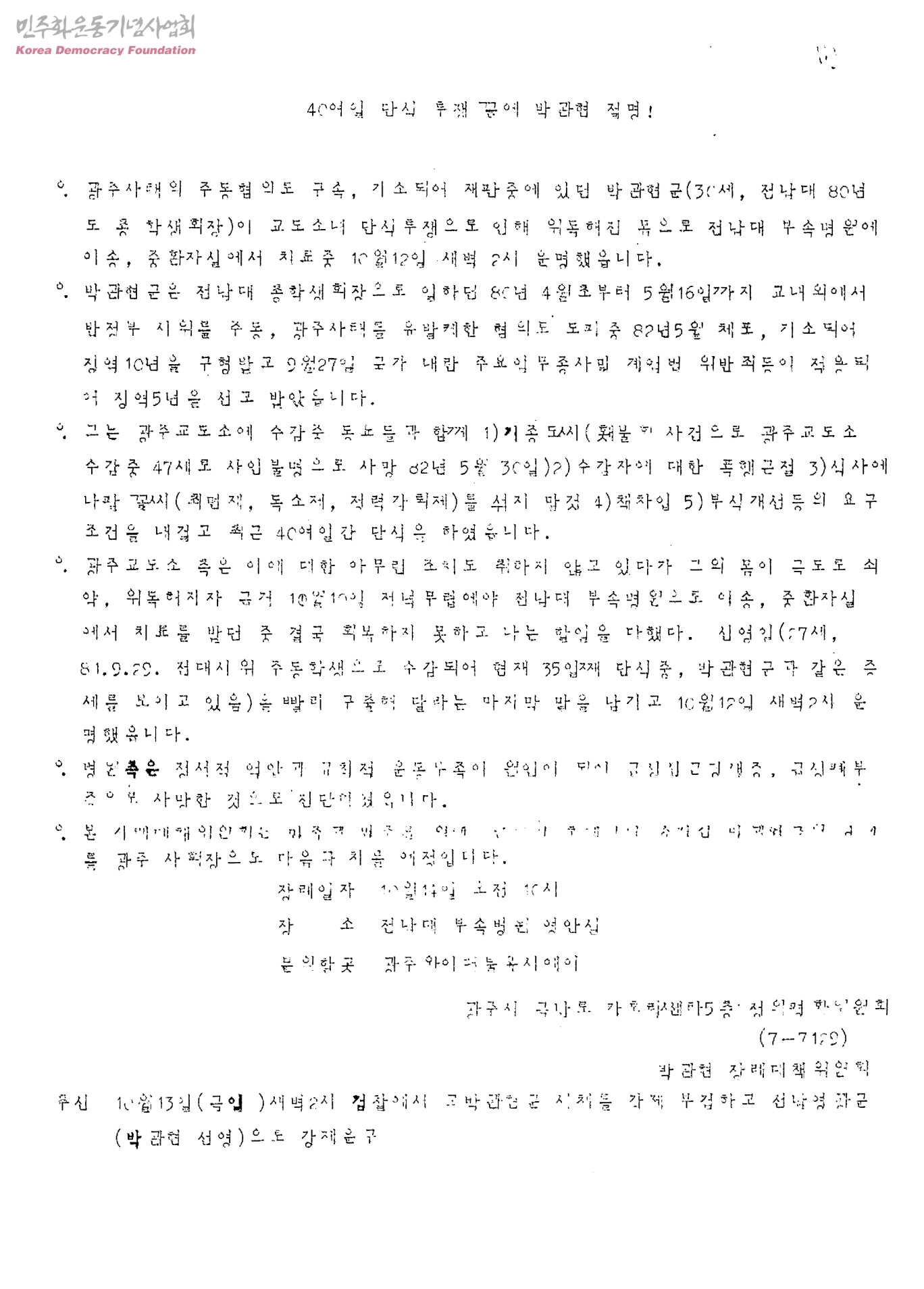40여일 단식 투쟁 끝에 박관현 절명!
