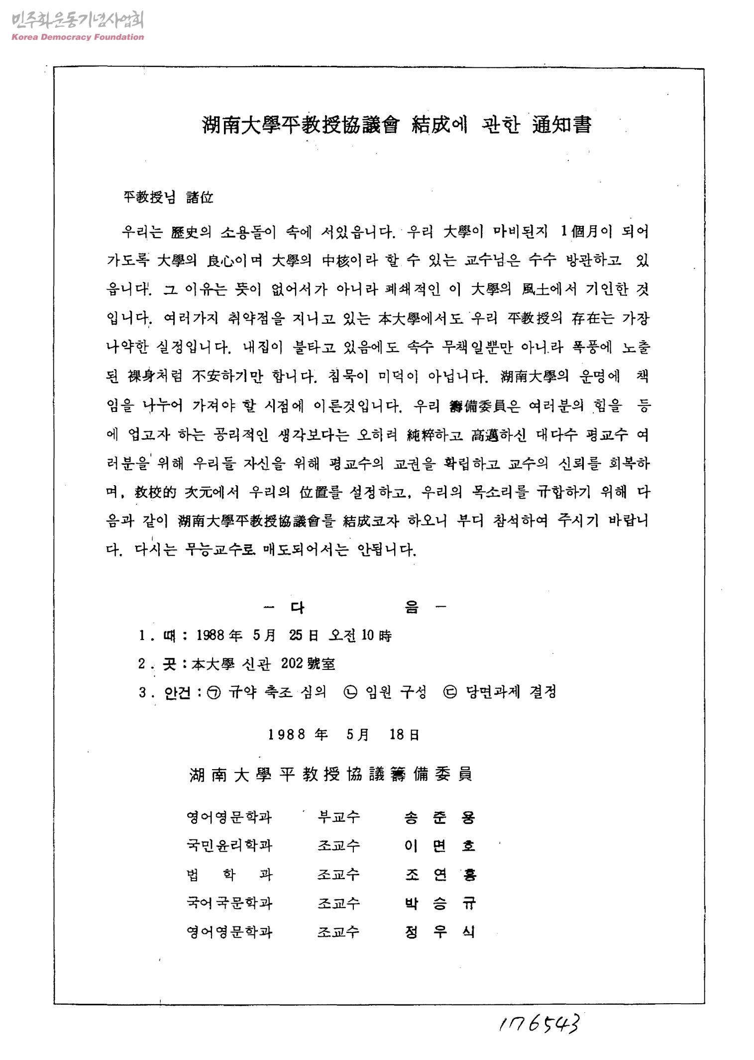 - 호남대학평교수협의주비위원 영어영문학과부교수 송준용, 국민윤리학과조교수 이면호, 법학과조교수 조연홍, 국어국문학과조교수 박승규, 영어영문학과조교수 정우식