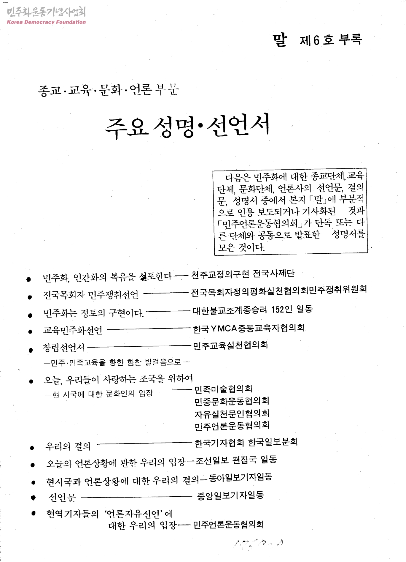 종교·교육·문화·언론부문 주요 성명·선언서-말 제6호 부록
