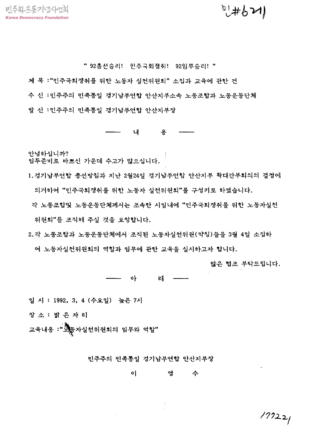 민주국회쟁취를 위한 노동자 실천위원회 소집과 교육에 관한 건 [수신:민주주의 민족통일 경기남부연합 안산지부소속 노동조합과 노동운동단체 발신:민주주의 민족통일 경기남부연합 안산지부장]
