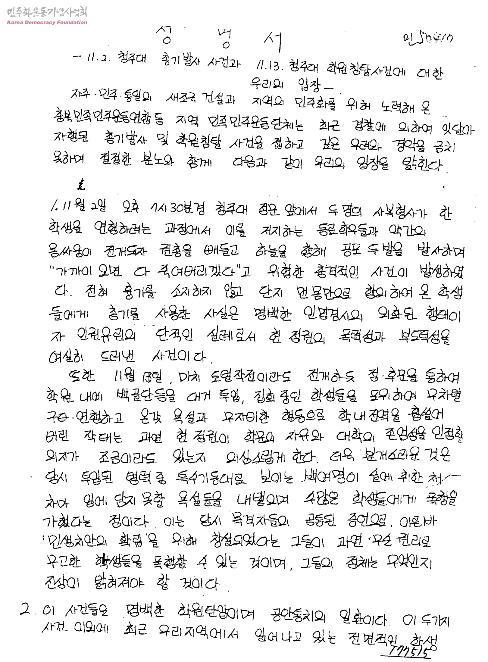 성명서-11.2 청주대 총기발사 사건과 11.13 청주대 학원침탈 사건에 대한 우리의 입장
