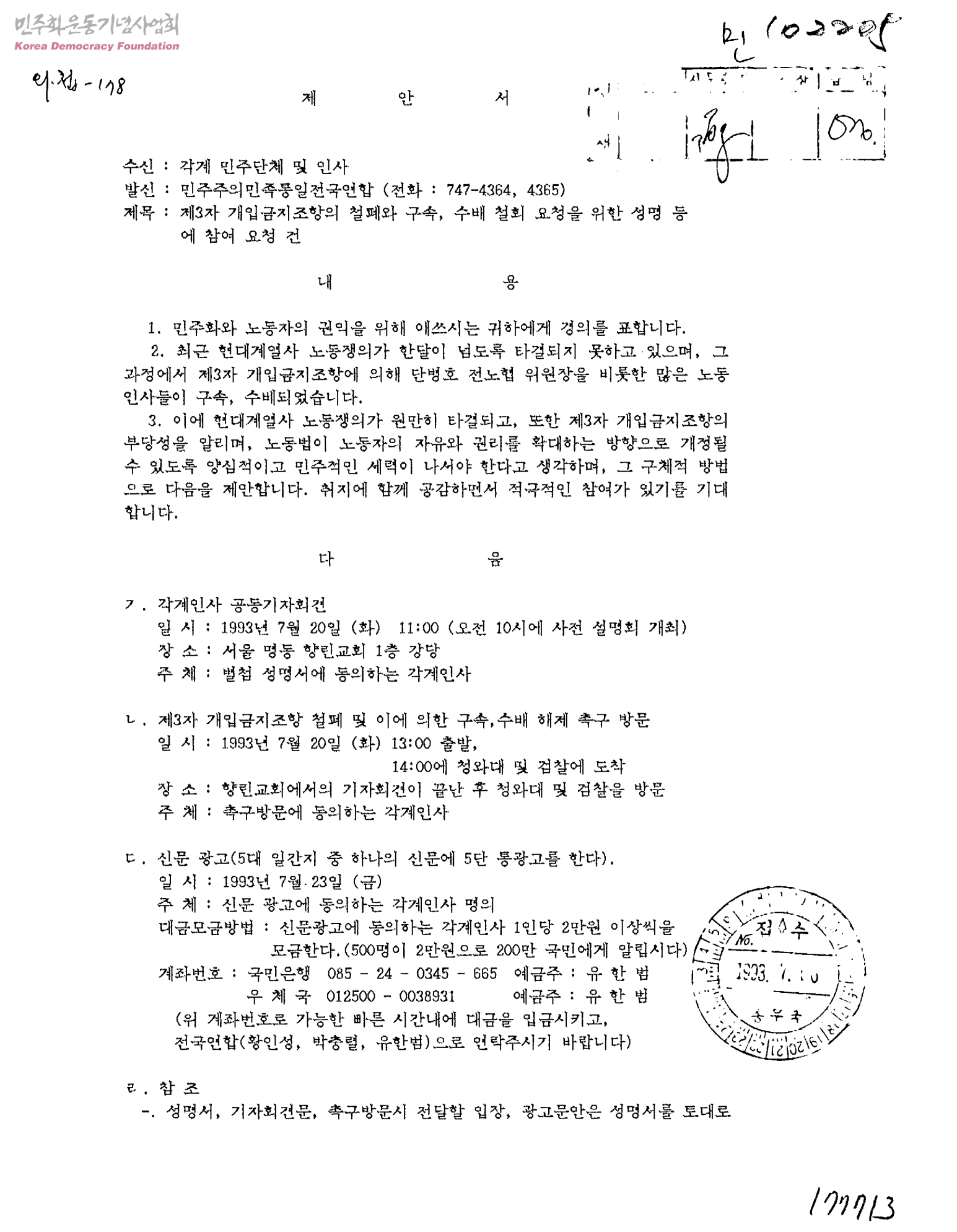 제안서- 제3자 개입금지조항의 철폐와 구속, 수배 철회 요청을 위한 성명 등에 참여 요청 건[수신:각계 민주단체 및 인사, 발신:민주주의민족통일전국연합]