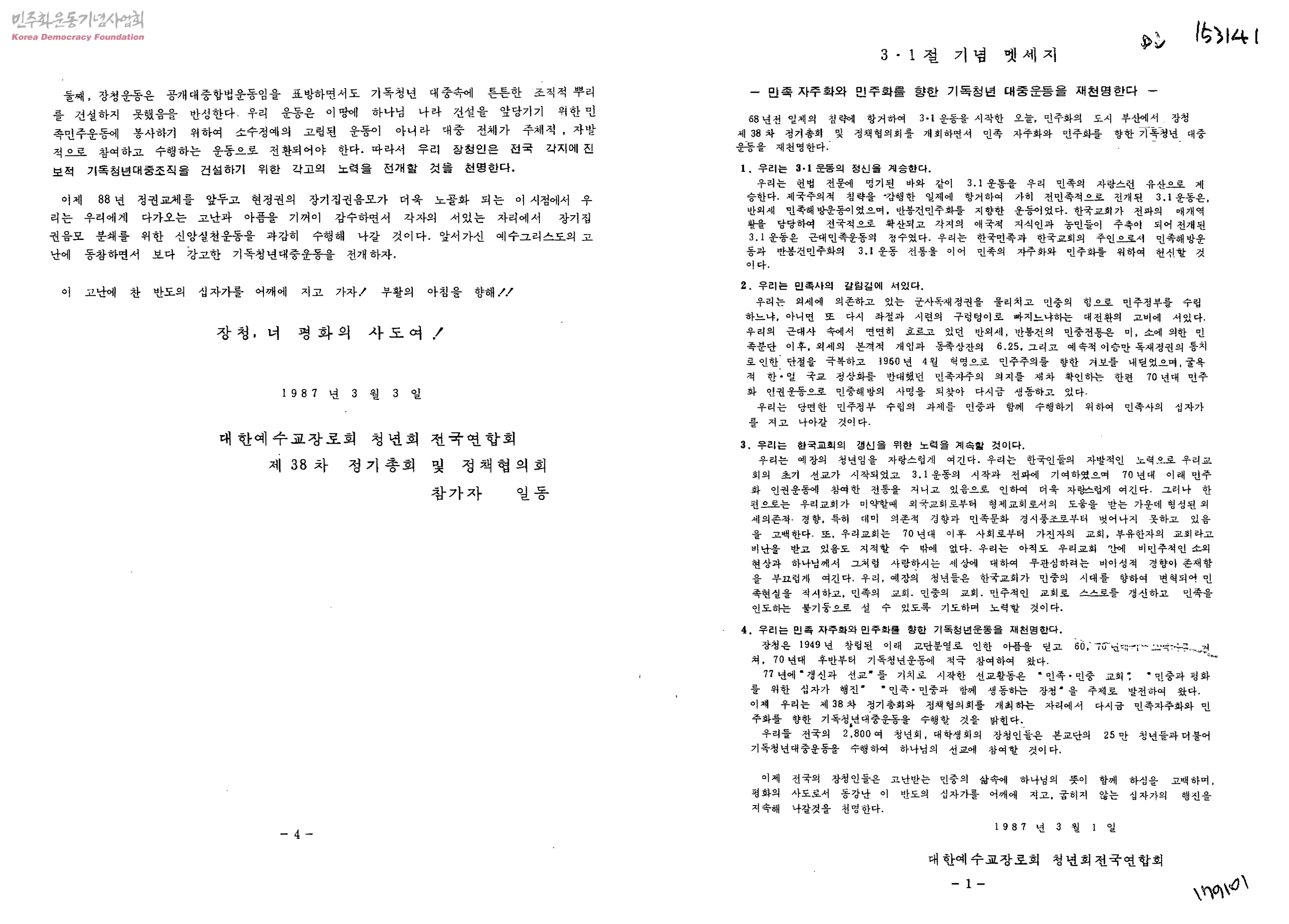 3.1절 기념 멧세지-민족 자주화와 민주화를 향한 기독청년 대중운동을 재천명한다