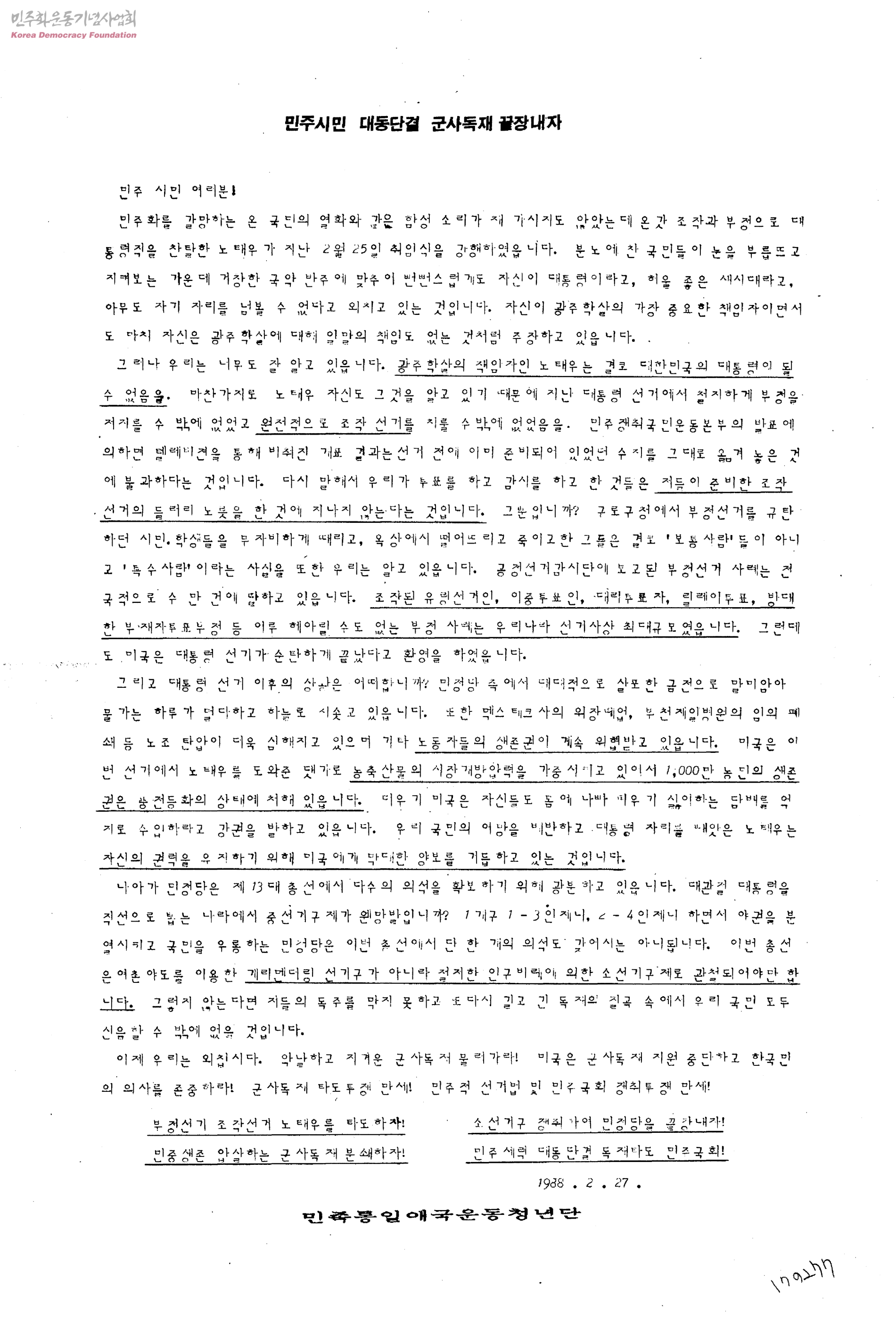 - 생산자 및 기증자가 ‘박용수’인 사진의 사용은 구매신청을 클릭하여 직접 사진 구매 신청을 하실 수 있습니다. 생산자 및 기증자가 ‘경향신문사’인 사진의 사용은 경향신문사 담당자(02-3701-1635)를 통해 구매하실 수 있습니다. 그 외의 생산자 및 기증자는 민주화운동기념사업회 사료관 담당자( hyunchaek@kdemo.or.kr / 02-6440-8961 )에 문의바랍니다.