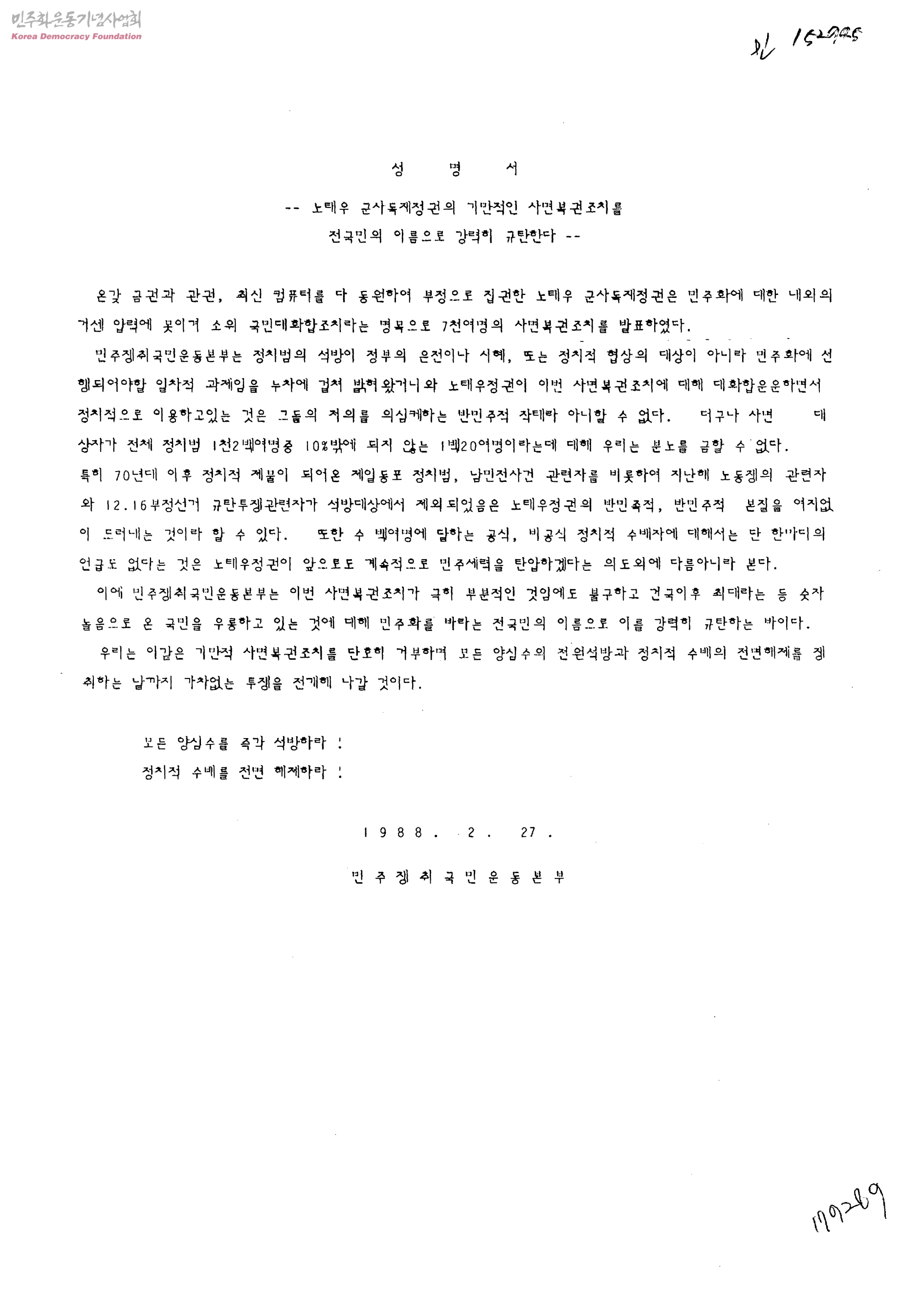 성명서-노태우 군사독재정권의 기만적인 사면복권조치를 전국민의 이름으로 강력히 규탄한다