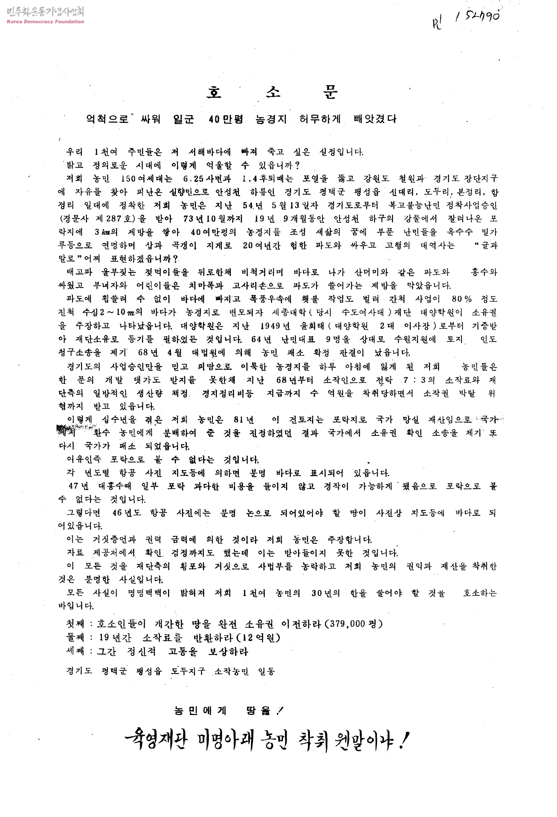 호소문 억척으로 싸워 일군 40만평 농경지 허무하게 빼앗겼다