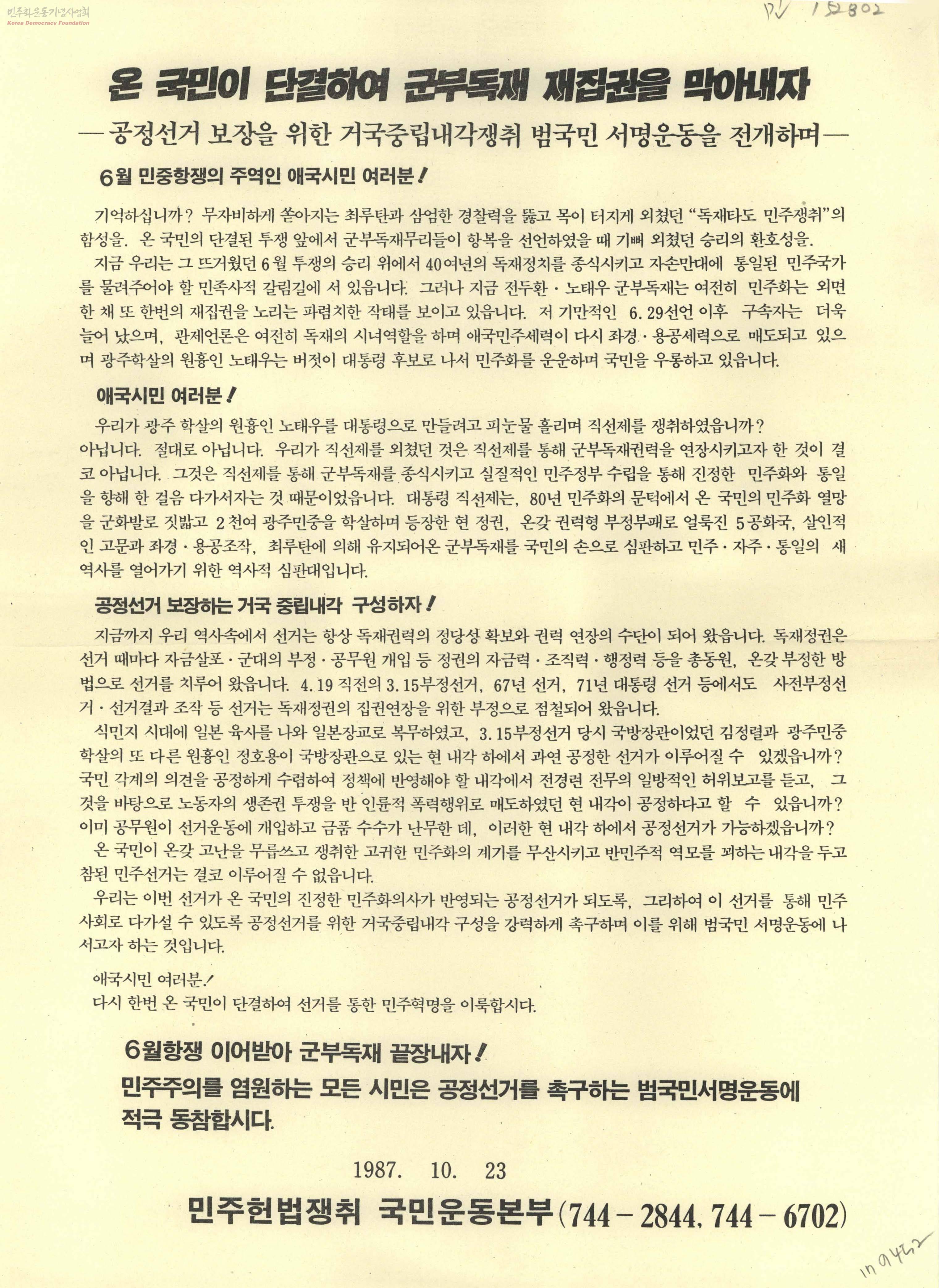 온 국민이 단결하여 군부독재 재집권을 막아내자-공정선거 보장을 위한 거구중립내각쟁취 범국민 서명운동을 전개하며