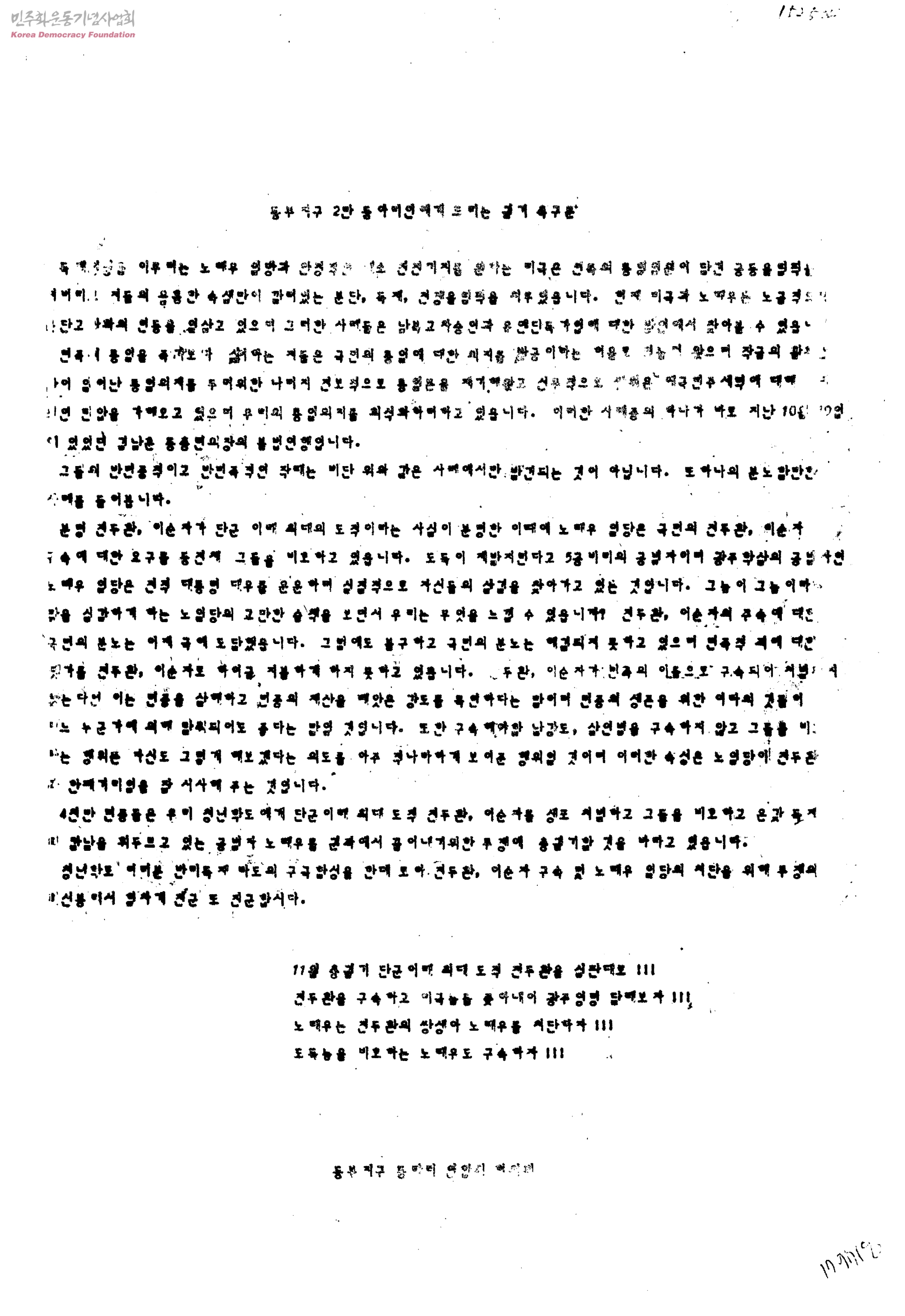 동부지구 2만 동아리인에게 드리는 궐기 촉구문