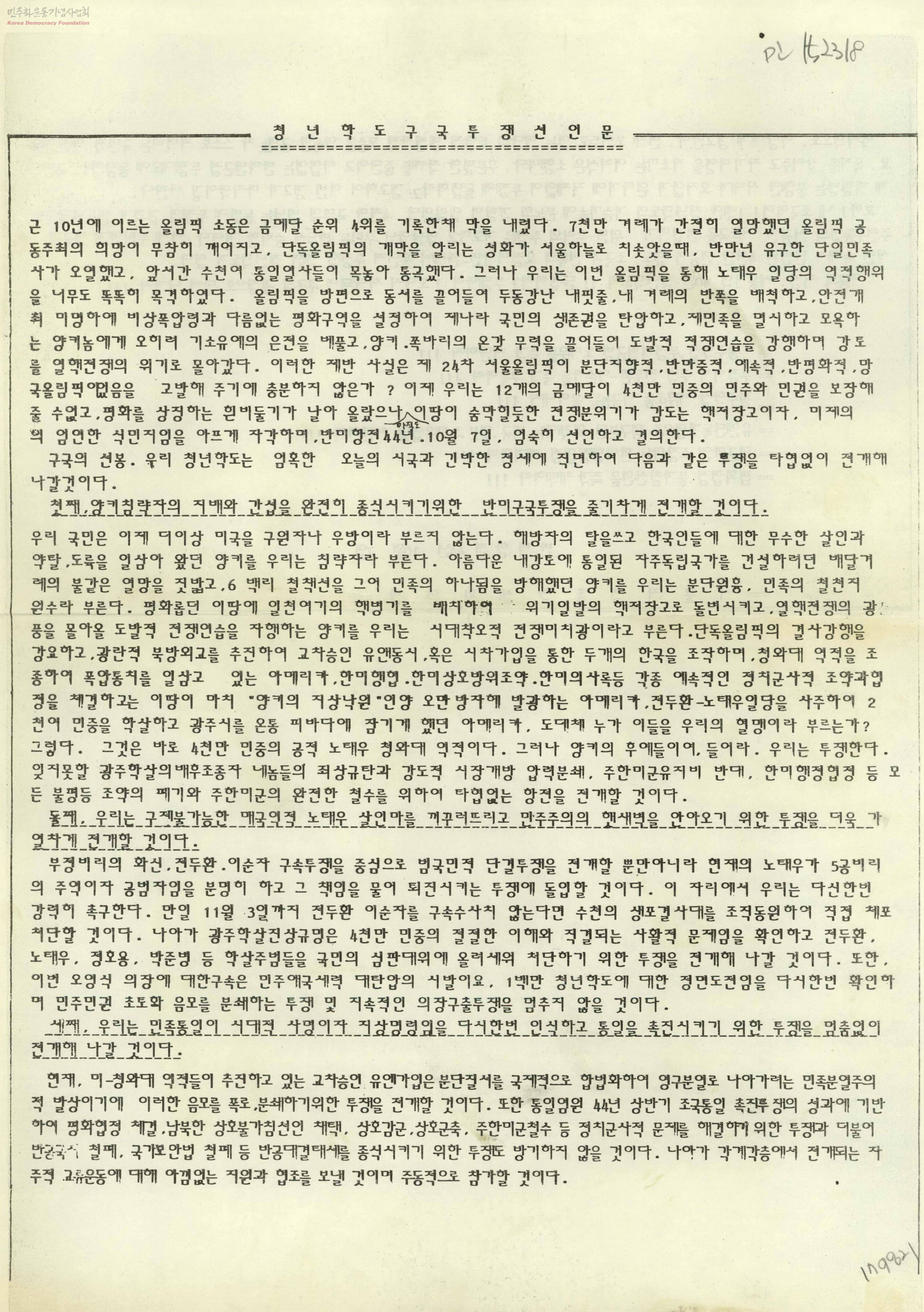 - 올림픽이 막을 내린 후 청년학도들이 미국의 지배와 간섭을 종식시키기 위해 반미구국투쟁을 전개할 것이며, 노태우를 처단하여 민주주의를 이룰 것이며, 민족통일을 위해 멈추지 않는 투쟁을 계속하겠다는 선언문