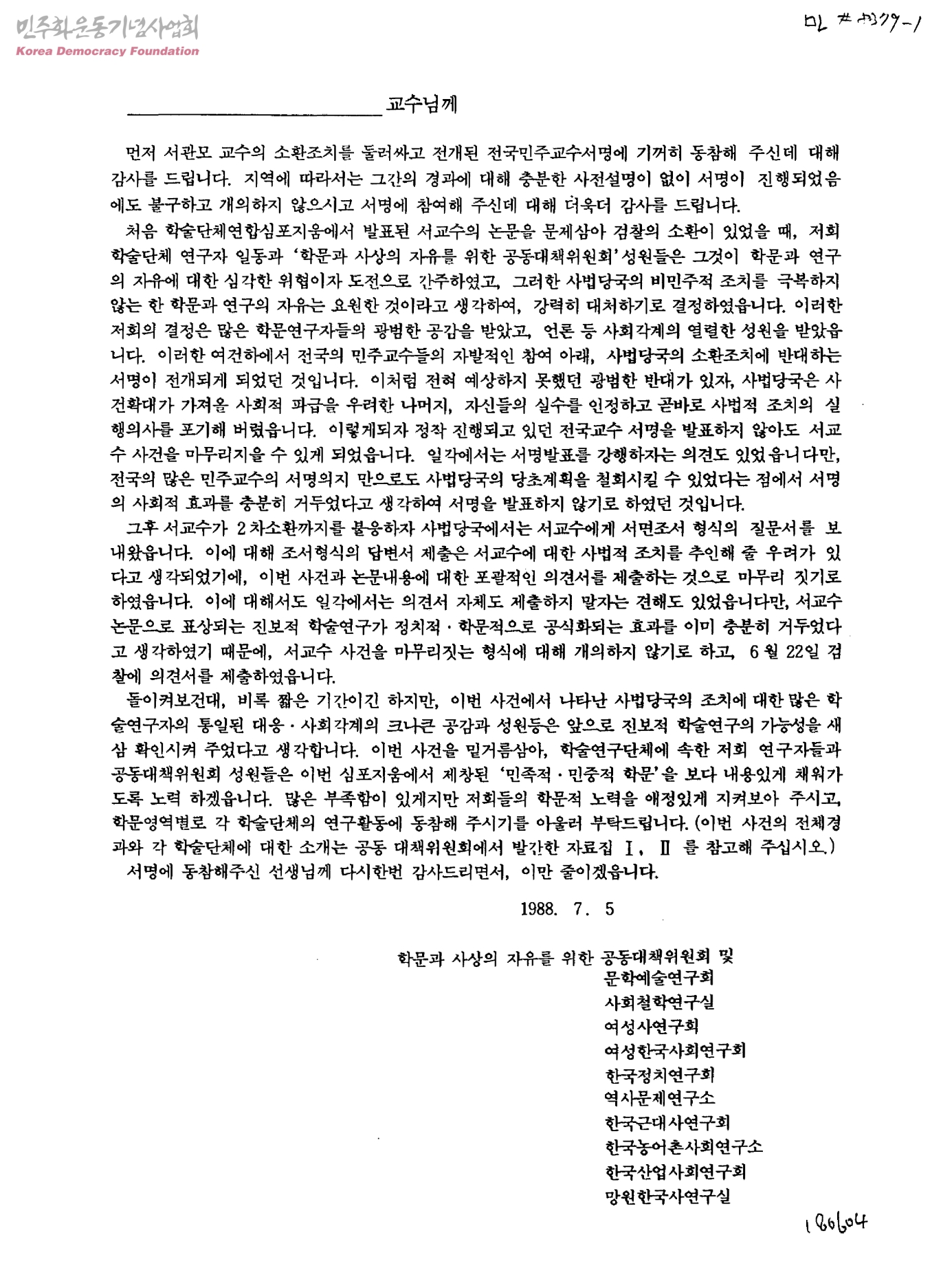 [서관모교수의 소환에 반대하는 전국민주교수서명 참여 감사글]