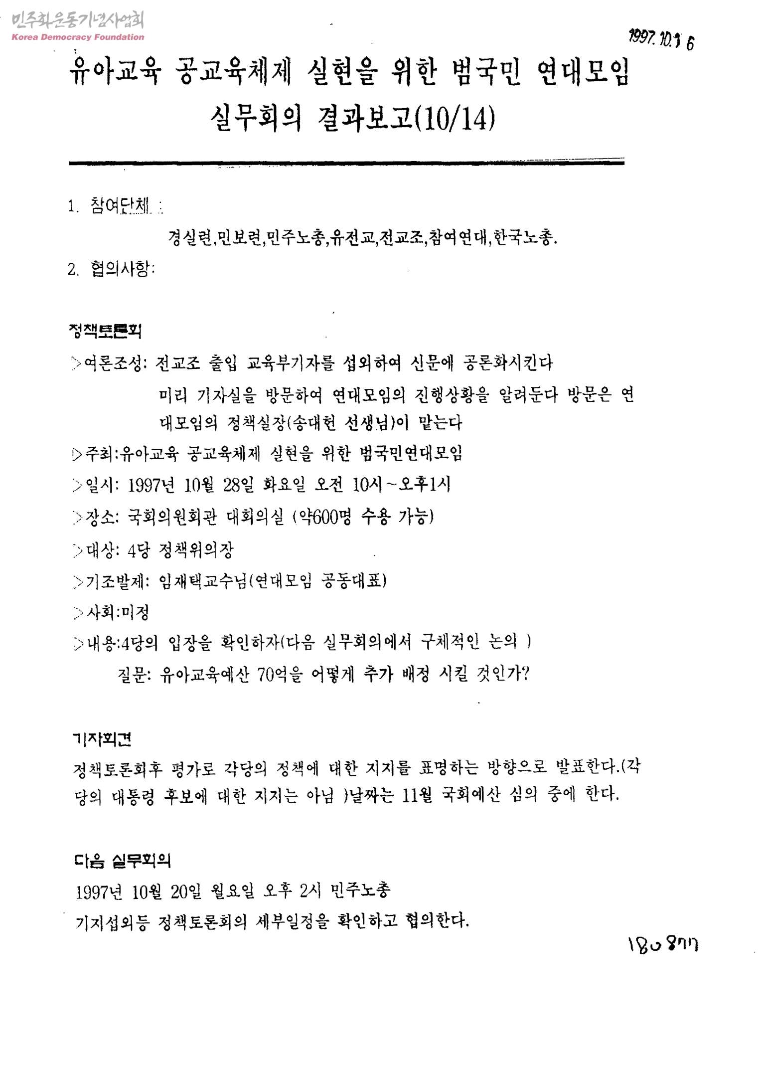 유아교육 공교육체제 실현을 위한 범국민 연대모임 실무회의 결과보고(10/14)