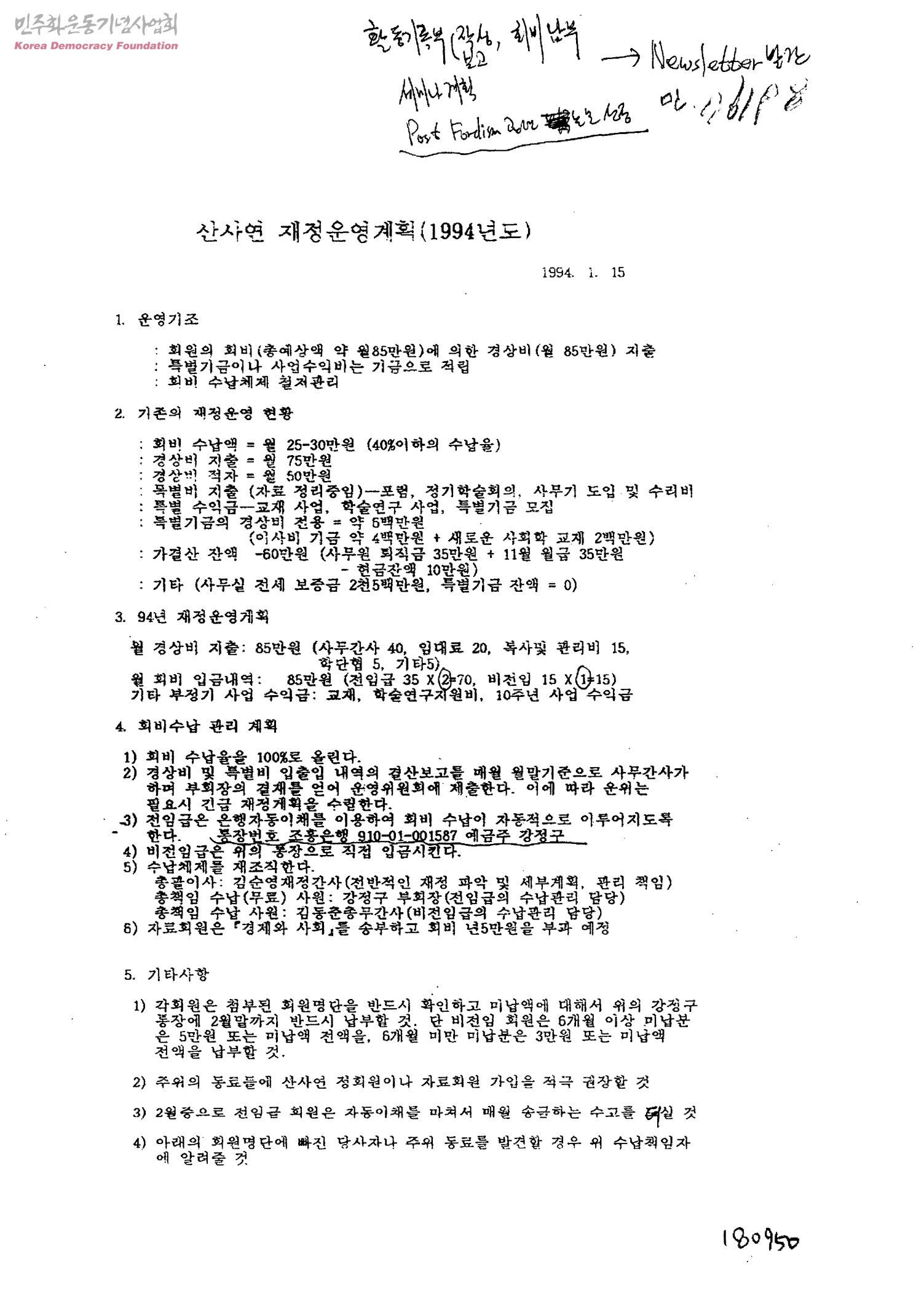 산사연 재정운영계획(1994년도)