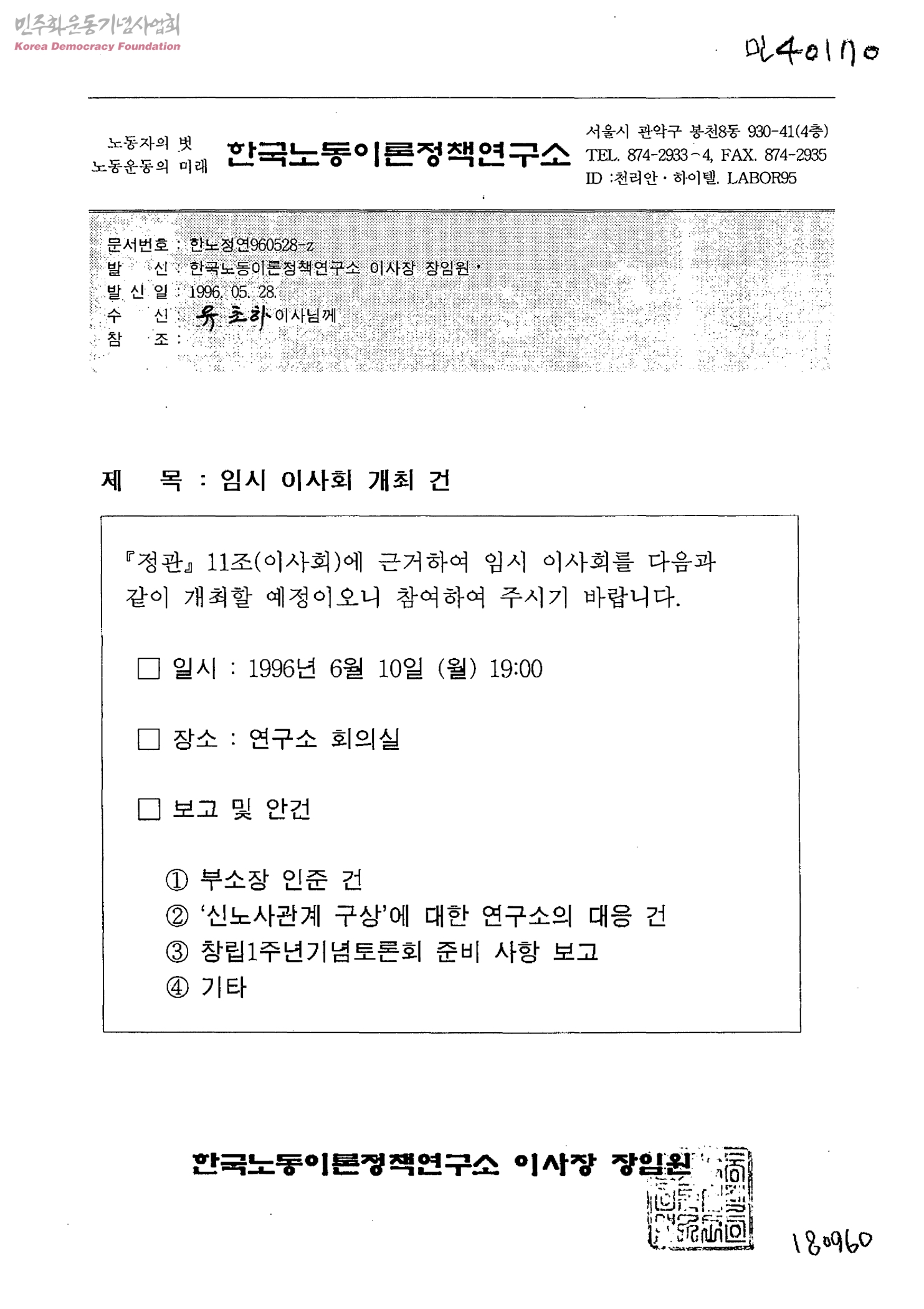 임시 이사회 개최 건[수신:유초하이사님, 발신:한국노동이론정책연구소이사장 장임원]