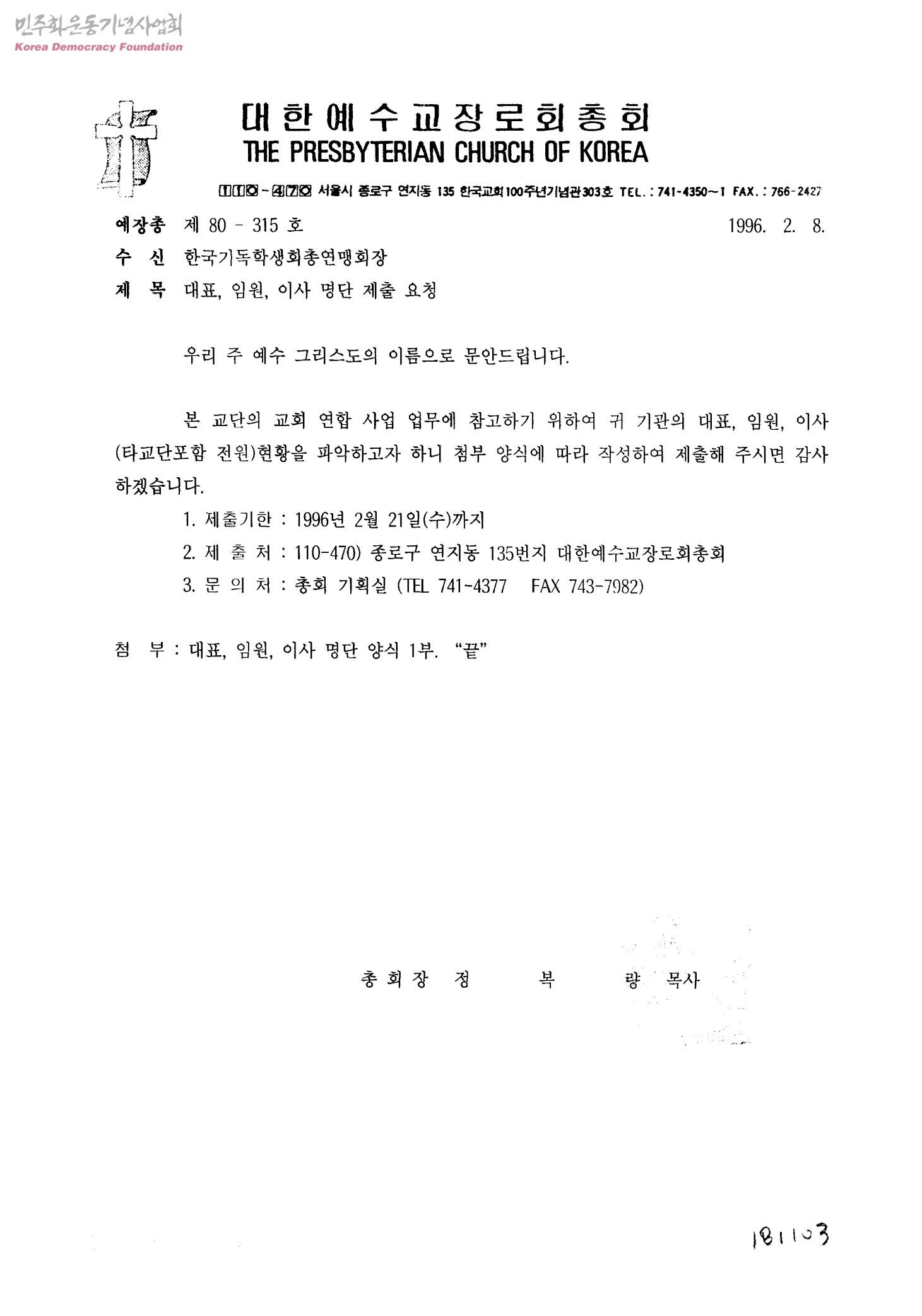 대표, 임원, 이사 명단 제출 요청[수신:한국기독학생회총연맹회장]