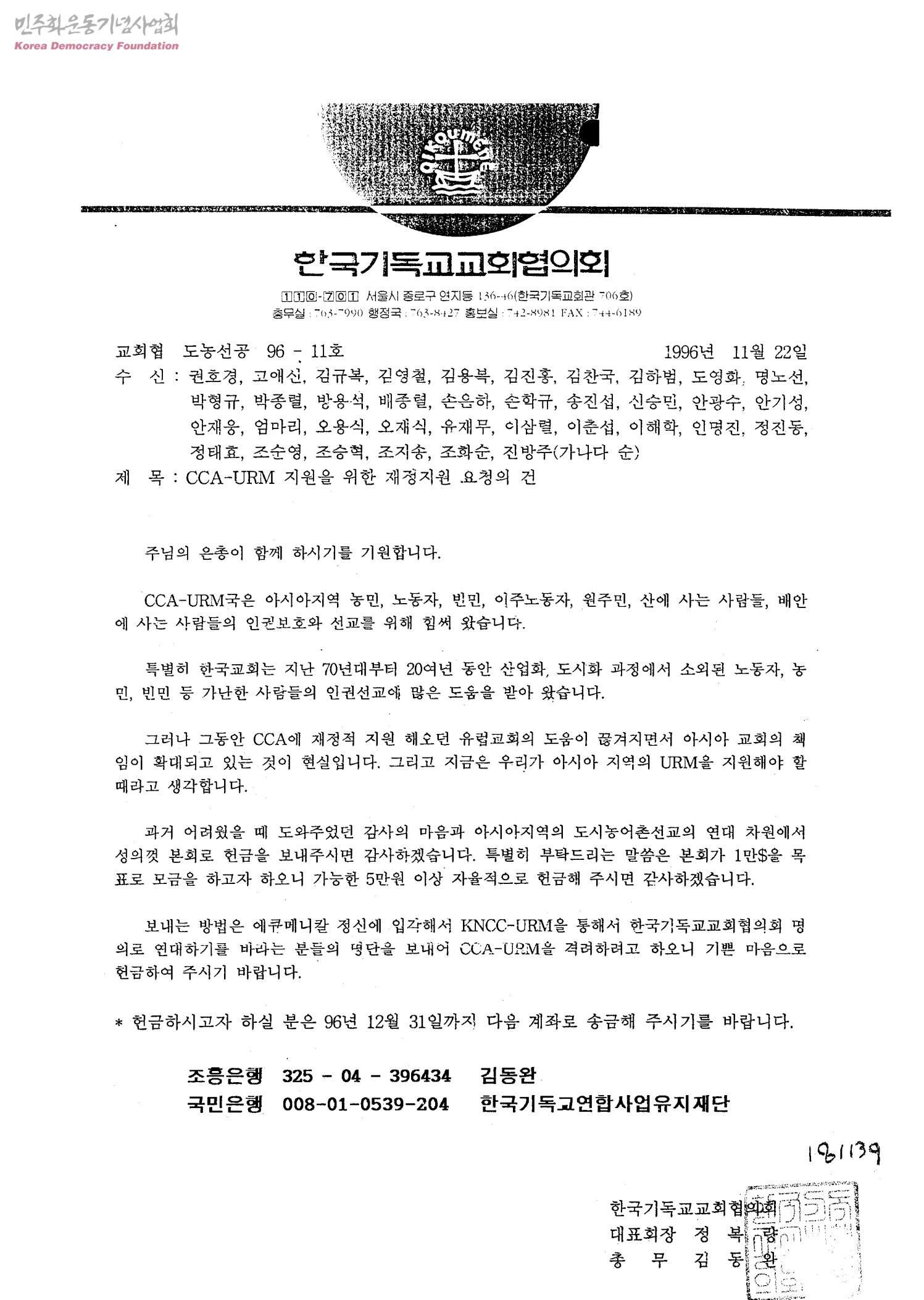 CCA-URM 지원을 위한 재정지원 요청의 건[수신:권호경, 고애신, 김규복, 김영철, 김용복, 김진홍, 김찬국, 김하범, 도영화, 명노선, 박형규, 박종렬, 방용석, 배종렬, 손윤하, 손학규, 송진섭, 신승민, 안광수, 안기성, 안재웅, 엄마리, 오용식, 오재식, 유재무, 이삼렬, 이춘섭, 이해학, 인명진, 정진동, 정태효, 조순영, 조승혁, 조지송, 조화순, 진방주]