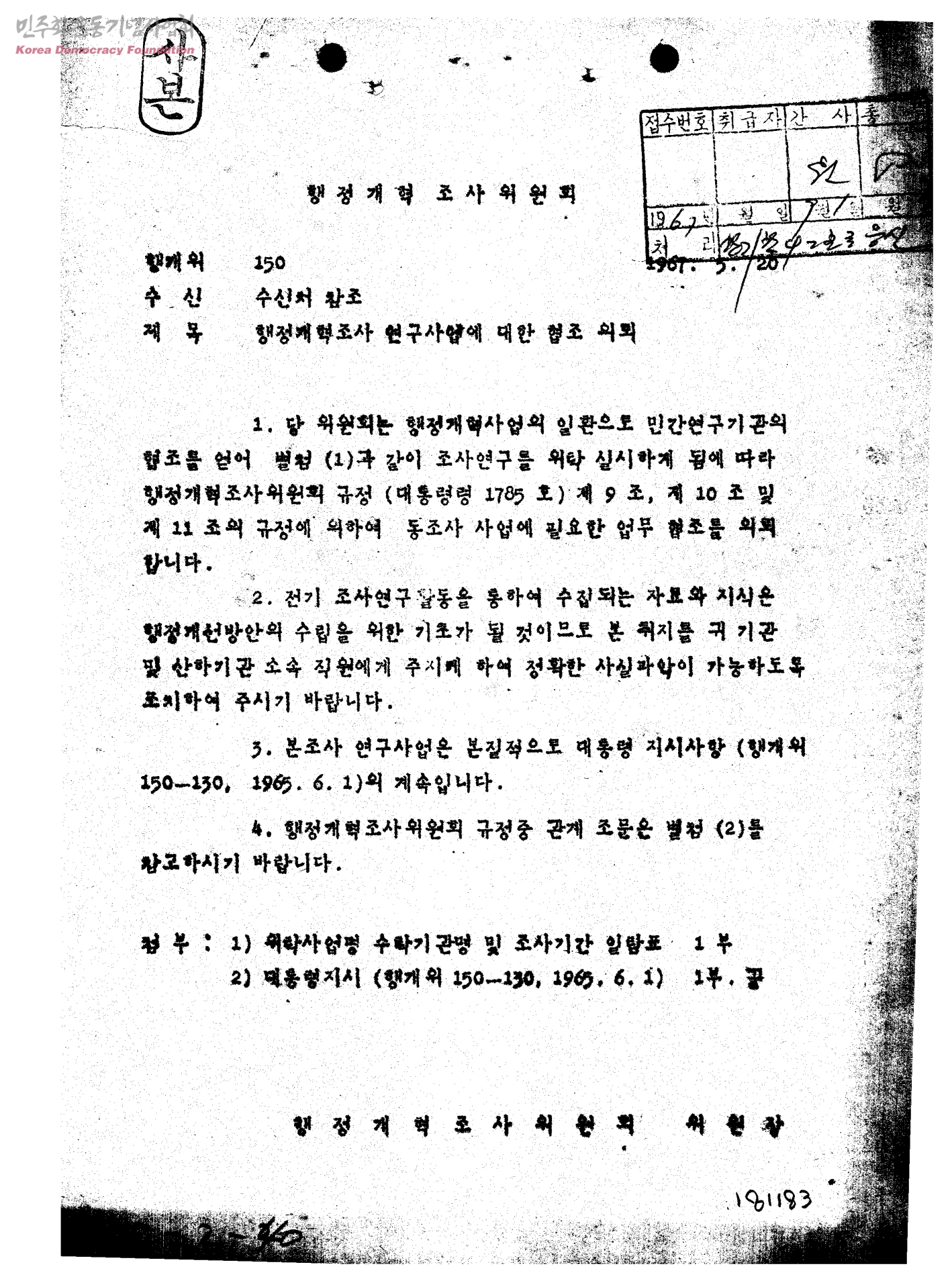 행정개혁조사 연구사업에 대한 협조 의뢰[발신:행정개혁조사위원회]