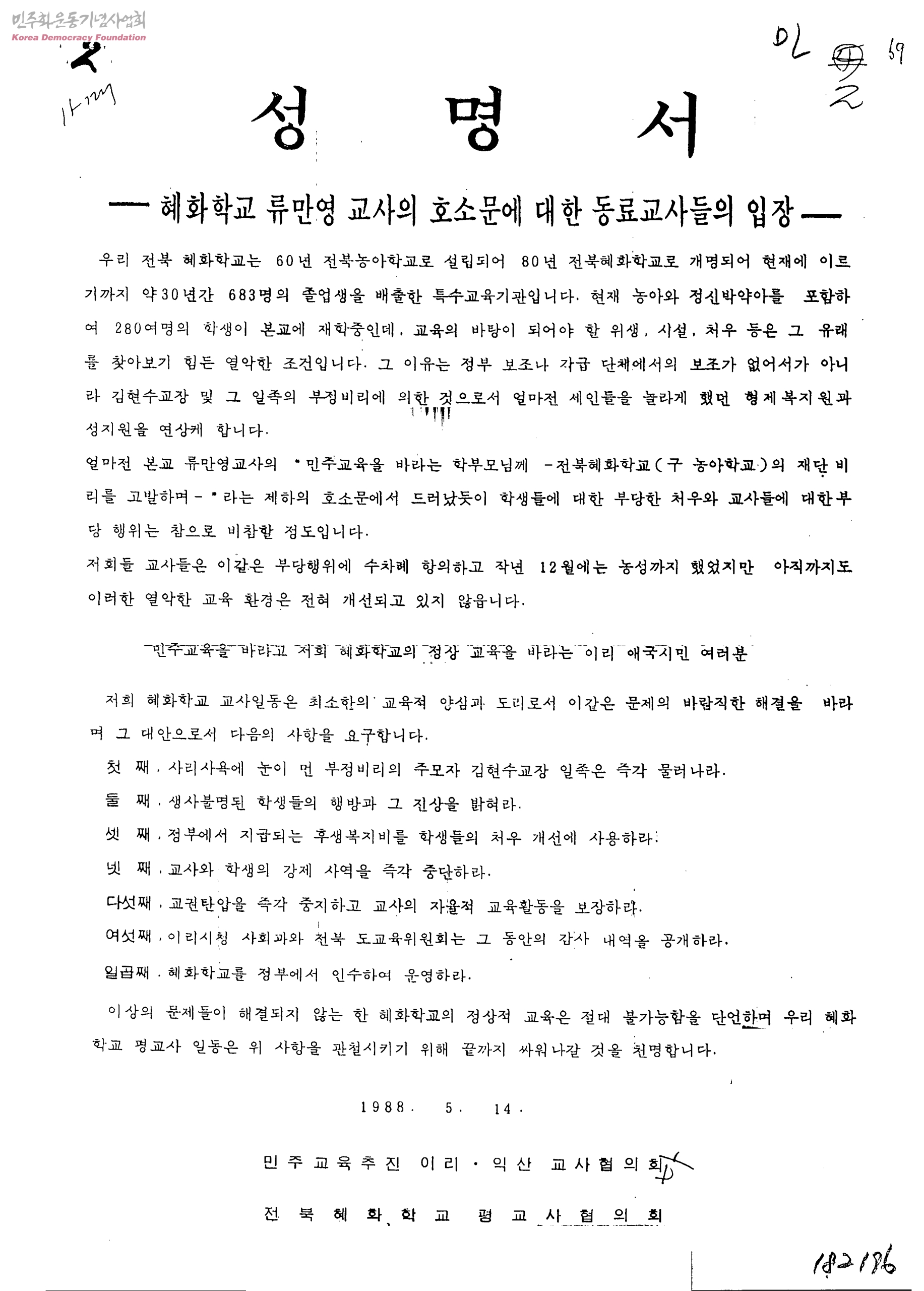 성명서-혜화학교 류만영 교사의 호소문에 대한 동료교사들의 입장