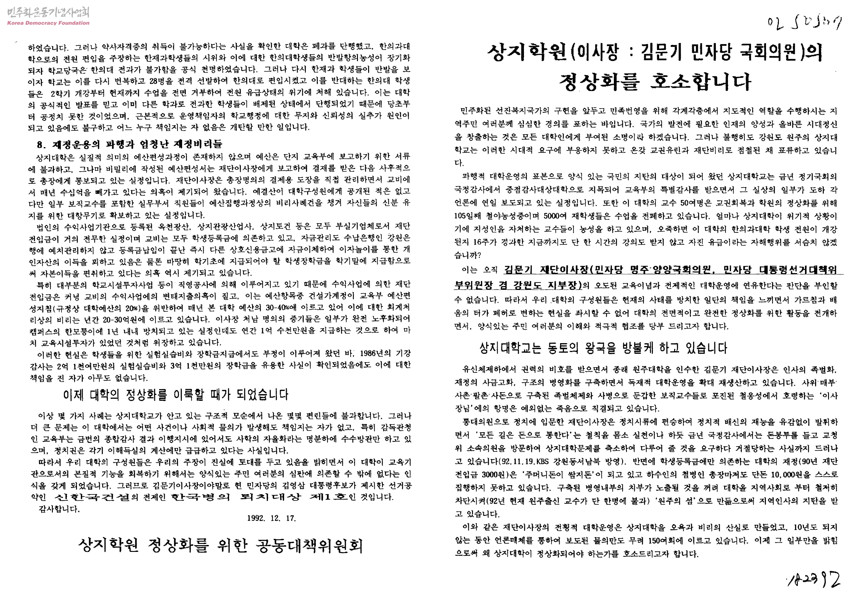상지학원(이사장 : 김문기 민자당 국회의원)의 정상화를 호소합니다
