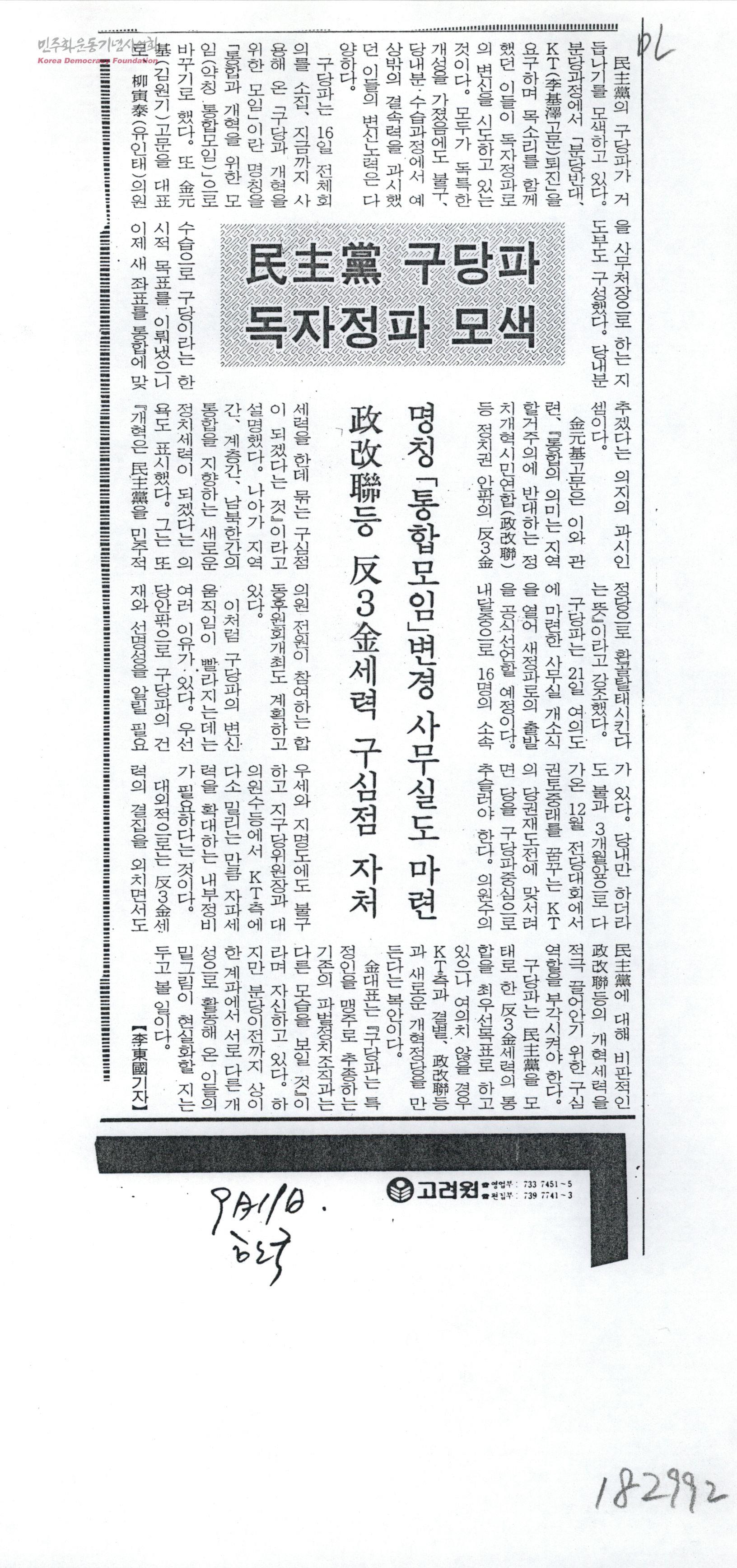 [신문스크랩]民主黨 구당파 독자정파 모색