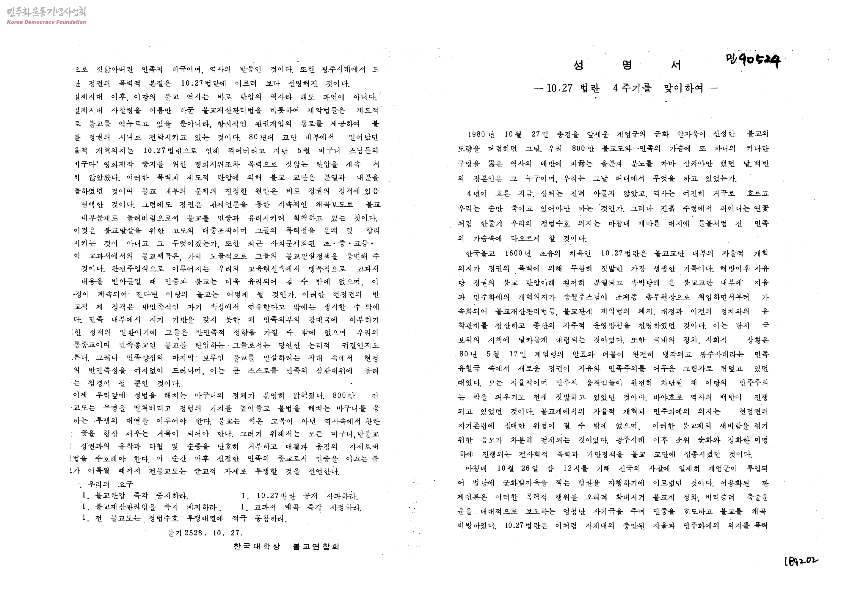 성명서-10.27 법란 4주기를 맞이하여