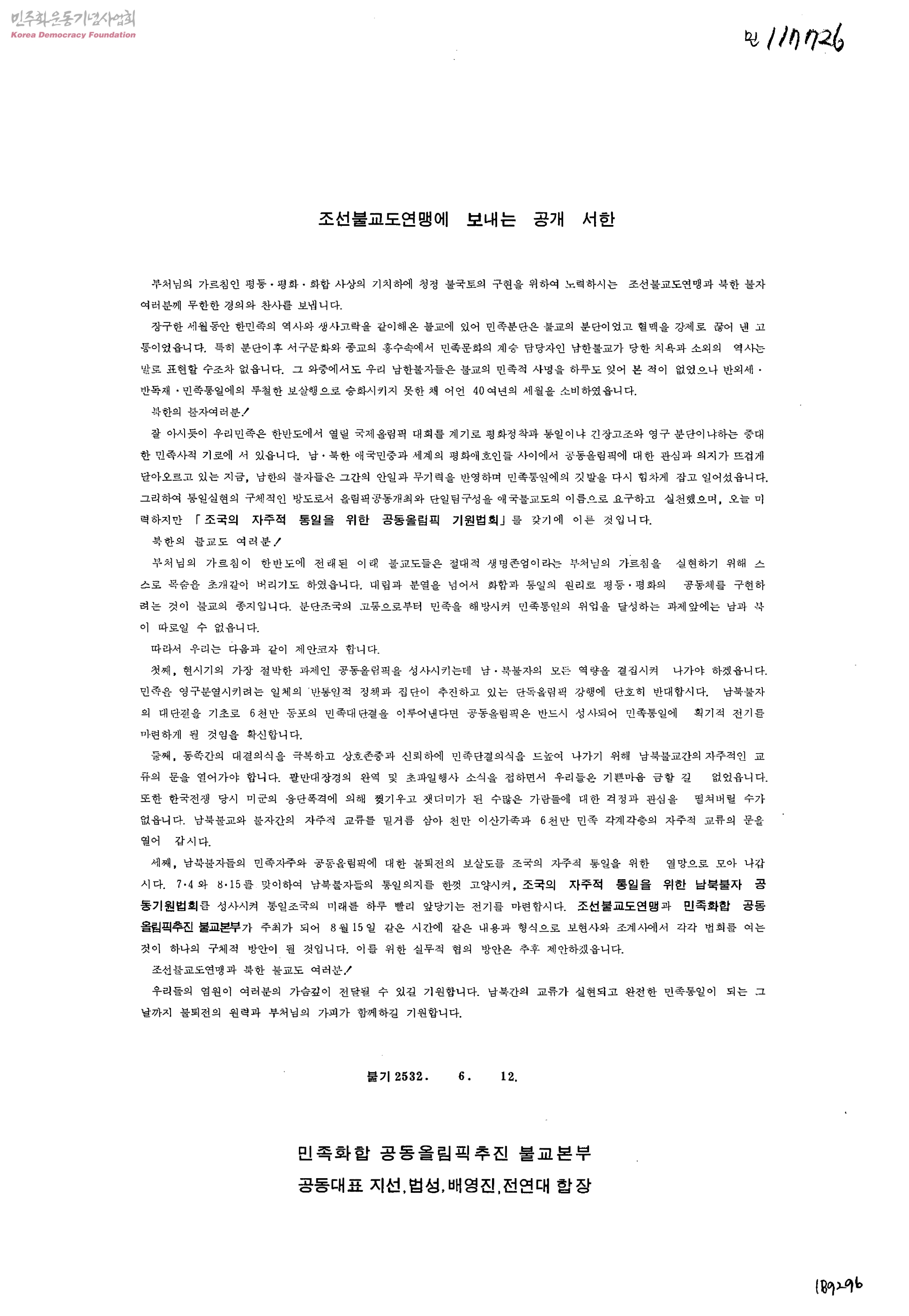- 민족화합공동올림픽추진불교본부공동대표지선,법성,배영진,전연대합장