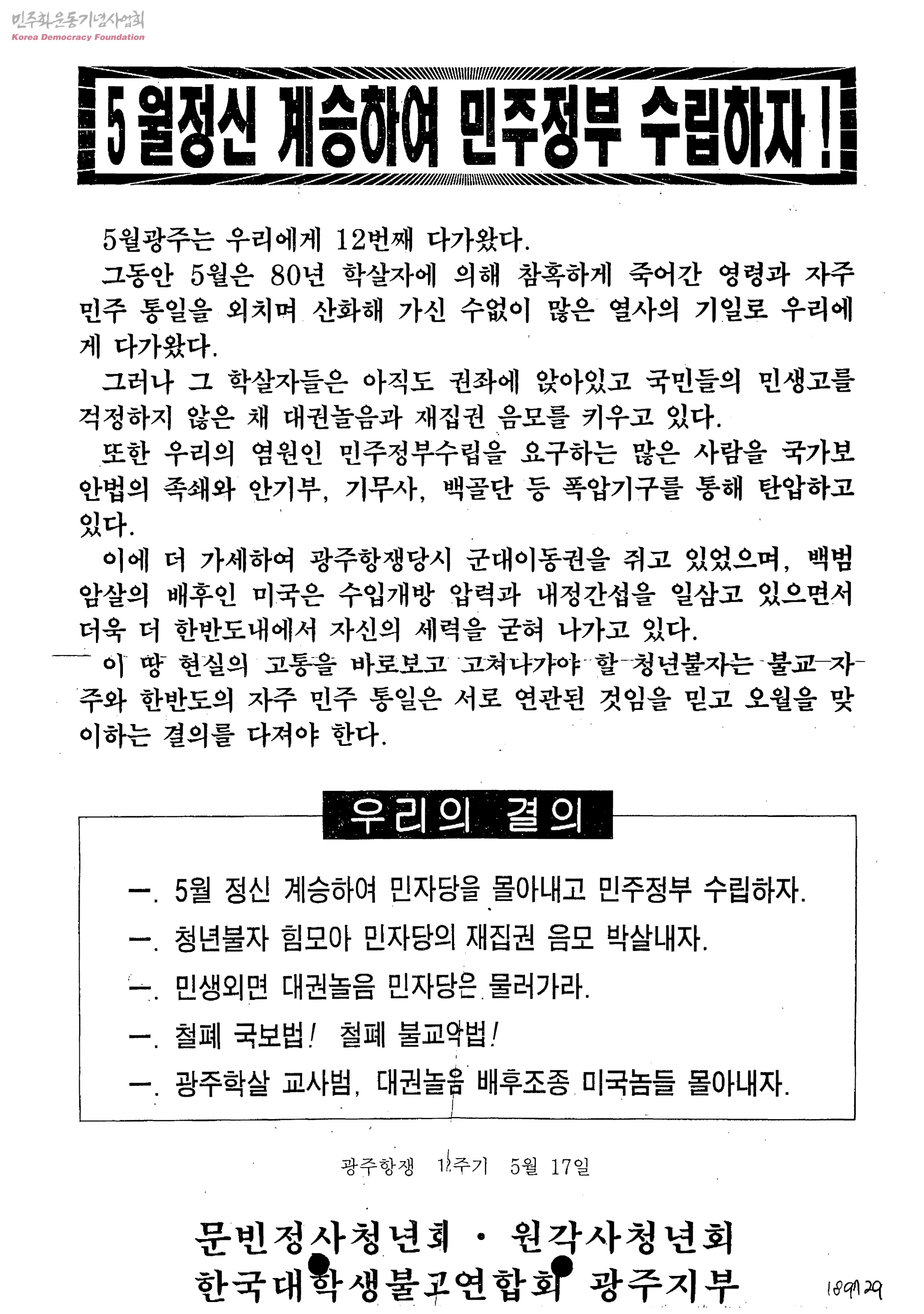 5월정신 계승하여 민주정부 수립하자